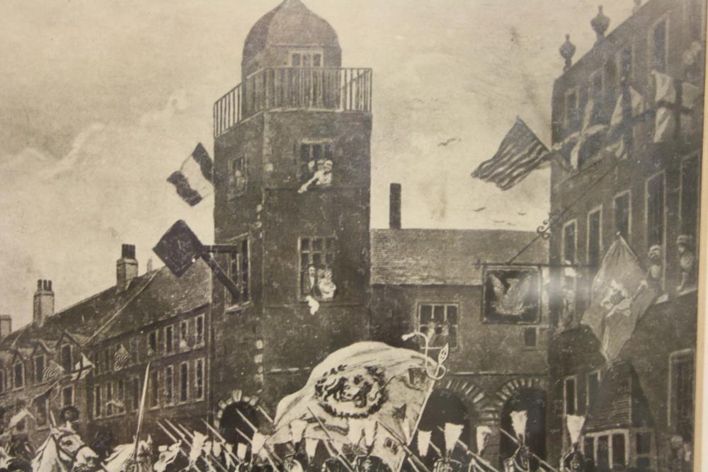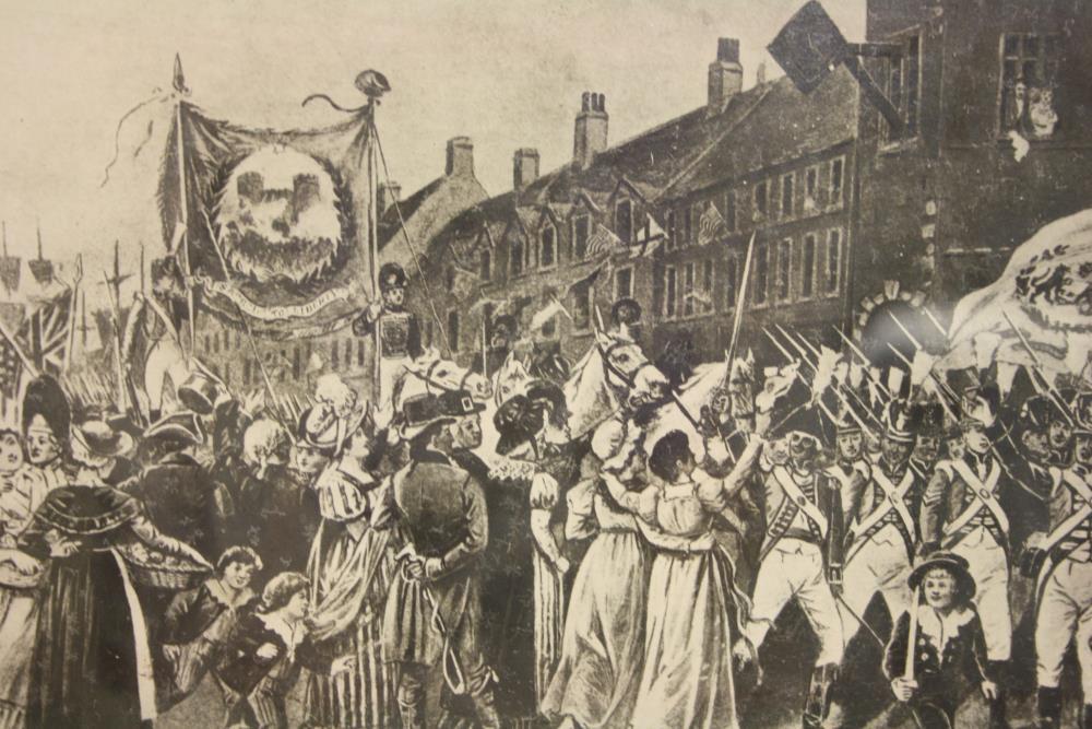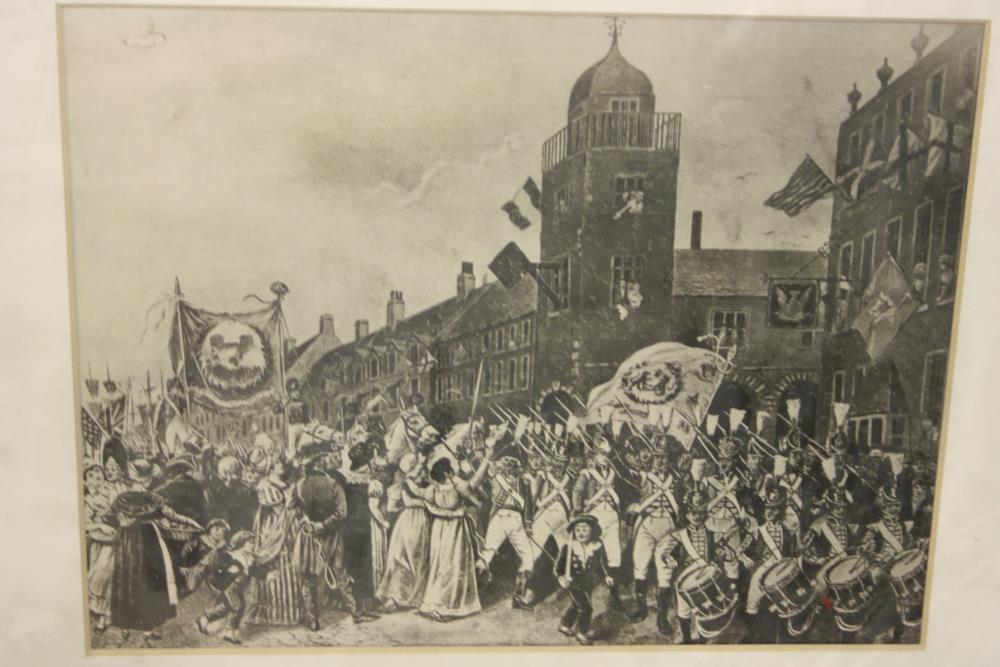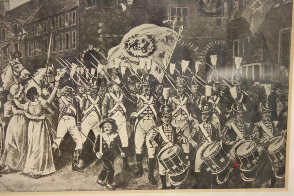 Print, monochrome, framed. Regiment of Volunteers marching through a street, with banner and marching band.;