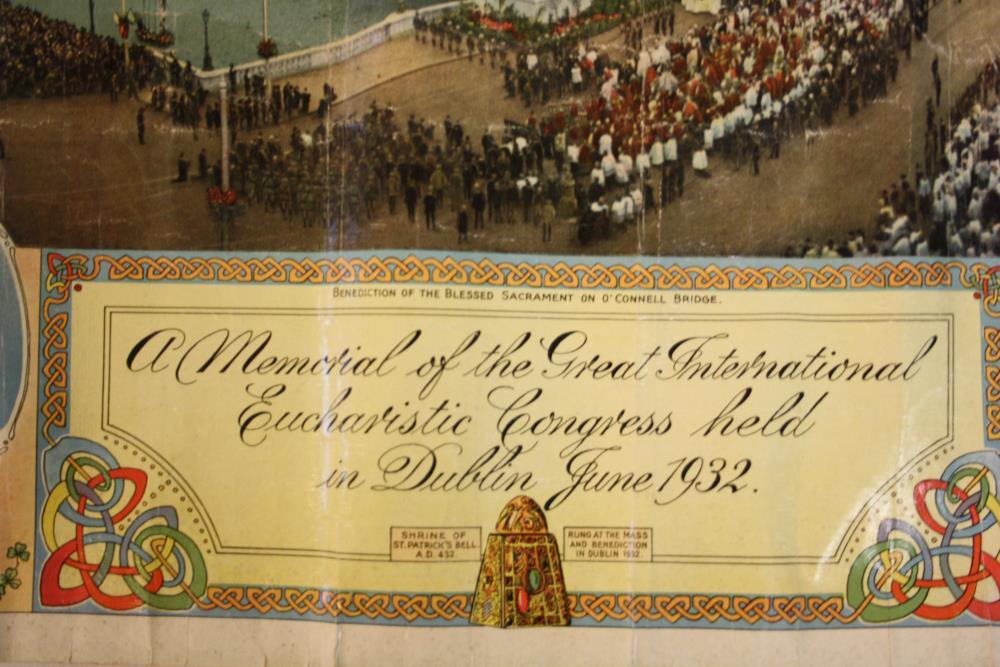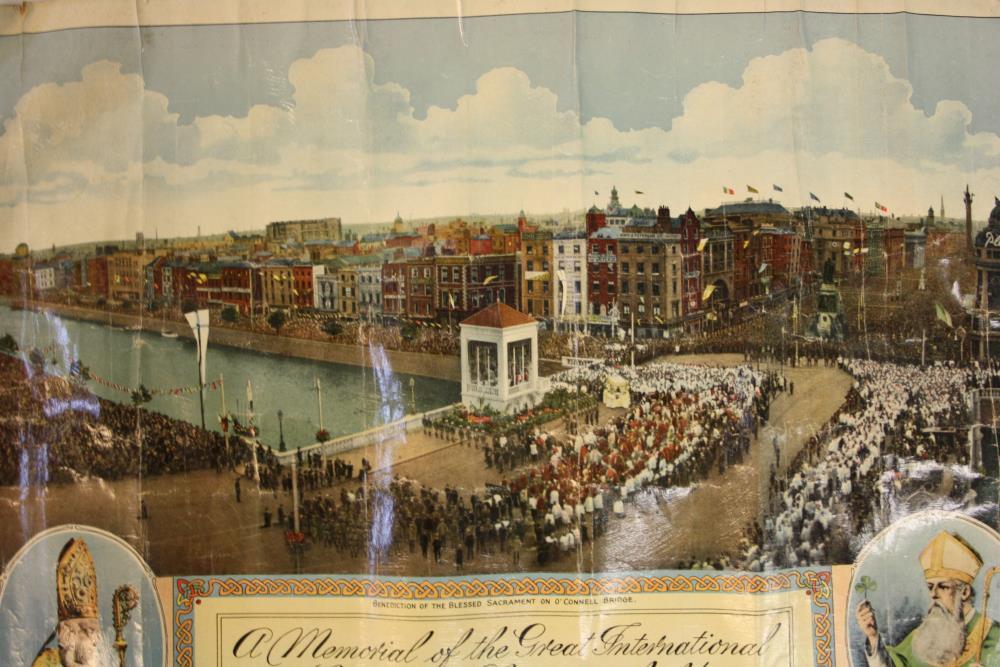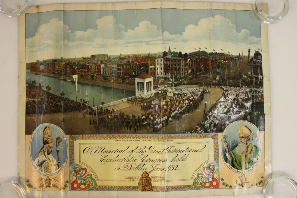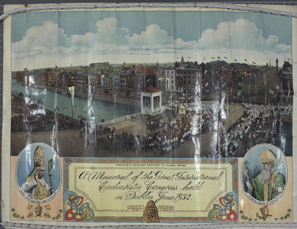 Poster, Eucharistic Congress, 1932. Memorial poster issued in 1932 to commemorate the ‘Great International Eucharistic Congress held in Dublin’ in June of that year. Aquatinted image showing the ‘Benediction of the Blessed Sacrament on O’Connell Bridge’.