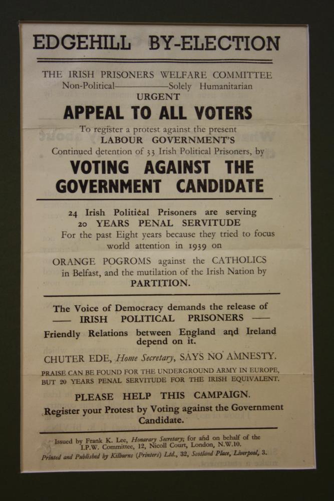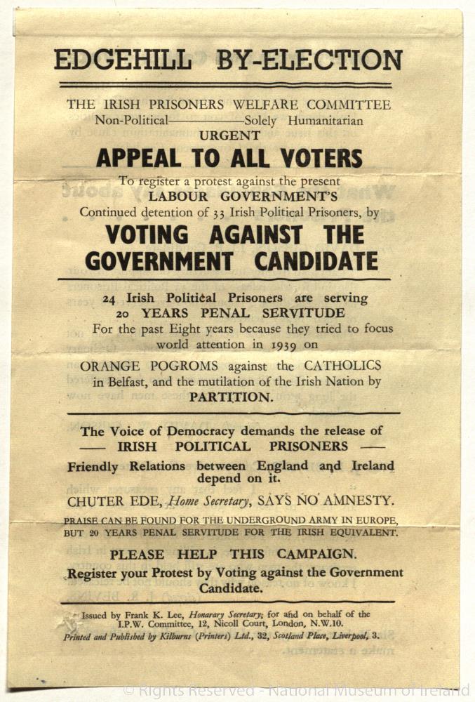 Leaflet, issued by the Irish Prisoners Welfare Committee (UK), c. mid to late 1940s. Urging voters to protest the incumbent Labour Government’s continued detention of 33 Irish Political Prisoners by voting against the government candidate. Issued from the I.P.W. Committee offices at 12 Nicholl Court, London. Printed by Kilburns Ltd, 32 Scotland Place, Liverpool.;