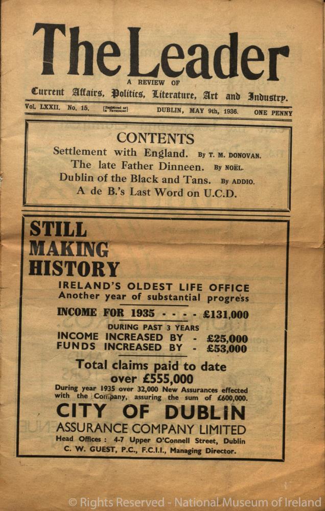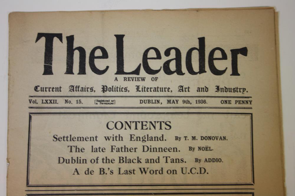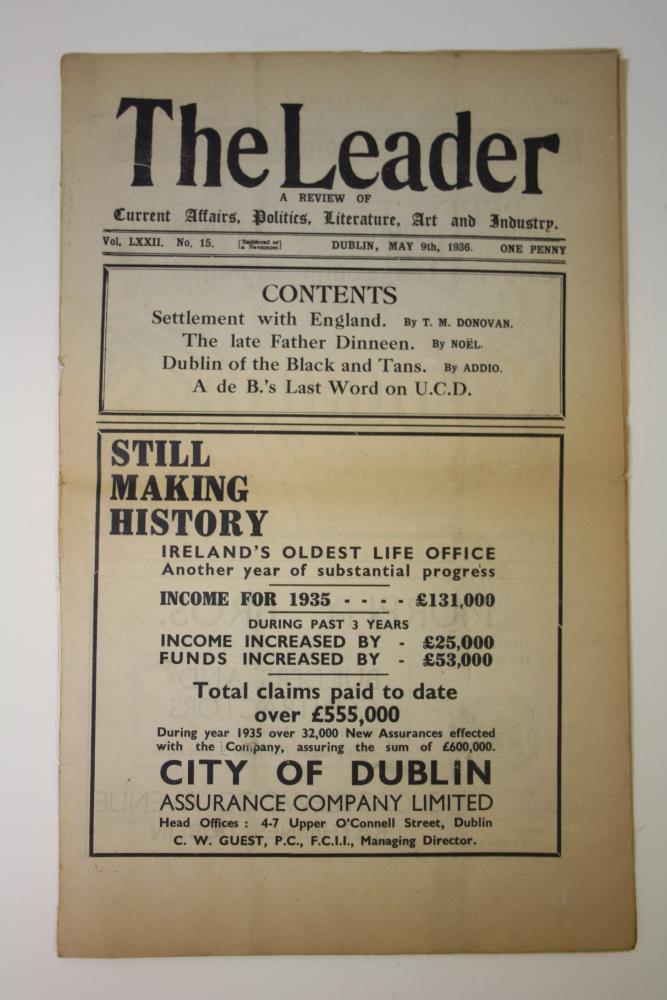 Copy of the newspaper ‘The Leader’. A review of current affairs, politics, literature, art and industry. Dublin, 9th May, 1936. Volume LXXII (72), No. 15.;