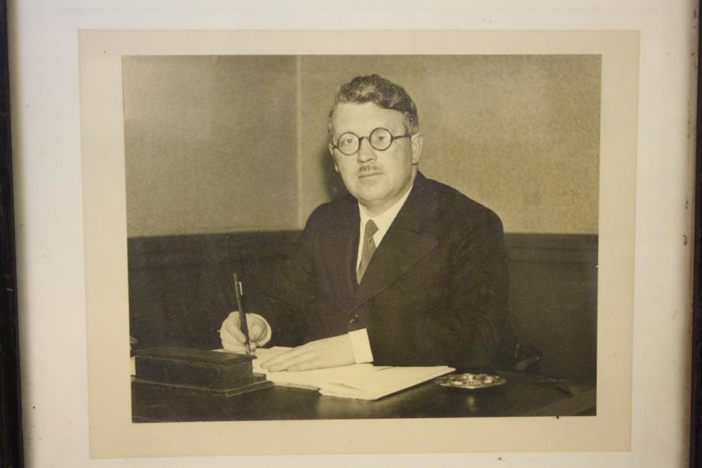 Framed photograph, man seated at desk, writing. Circa 1950s / 1960s. Black and white.;