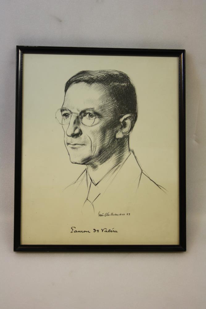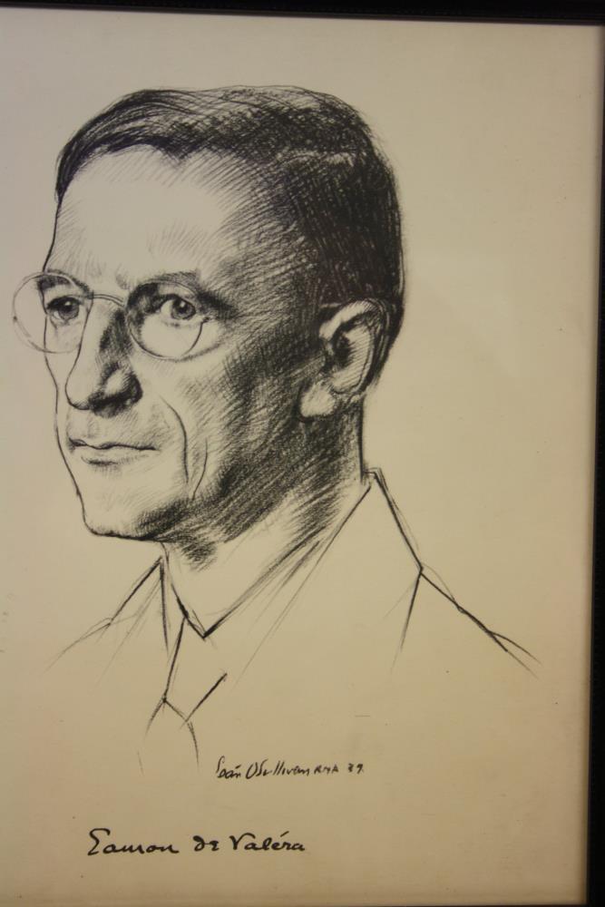 Copy of portrait sketch drawing of Eamon de Valera, head and shoulders, by Sean O'Sullivan, R.H.A., 1939 (signed). With de Valera's signature underneath. Black pencil or charcoal on white. On the back of the frame is written 'To Dear Fran, With Dev's and my (...) regard and love this Christmas and always (.....) Christmas 1960'.;