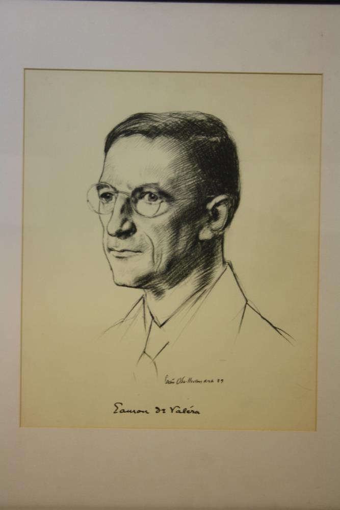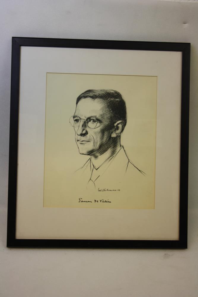 Copy of portrait sketch drawing of Eamon de Valera, head and shoulders, by Sean O'Sullivan, R.H.A., 1939 (signed). With de Valera's signature underneath. Black pencil or charcoal on white.;