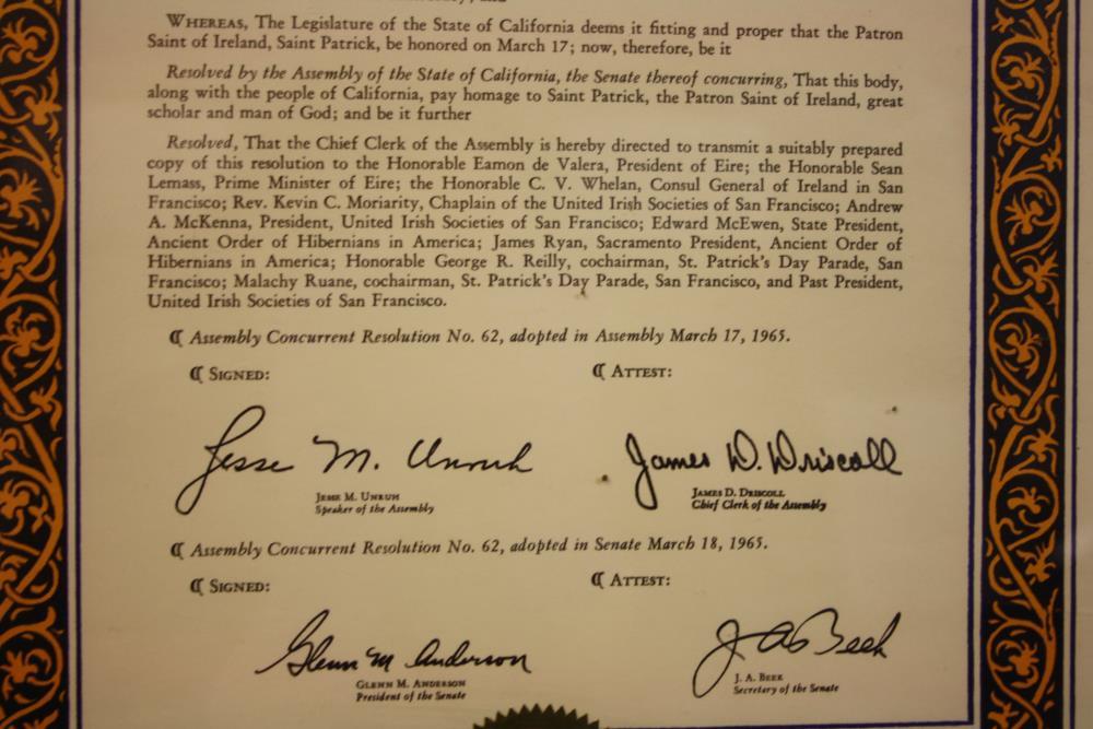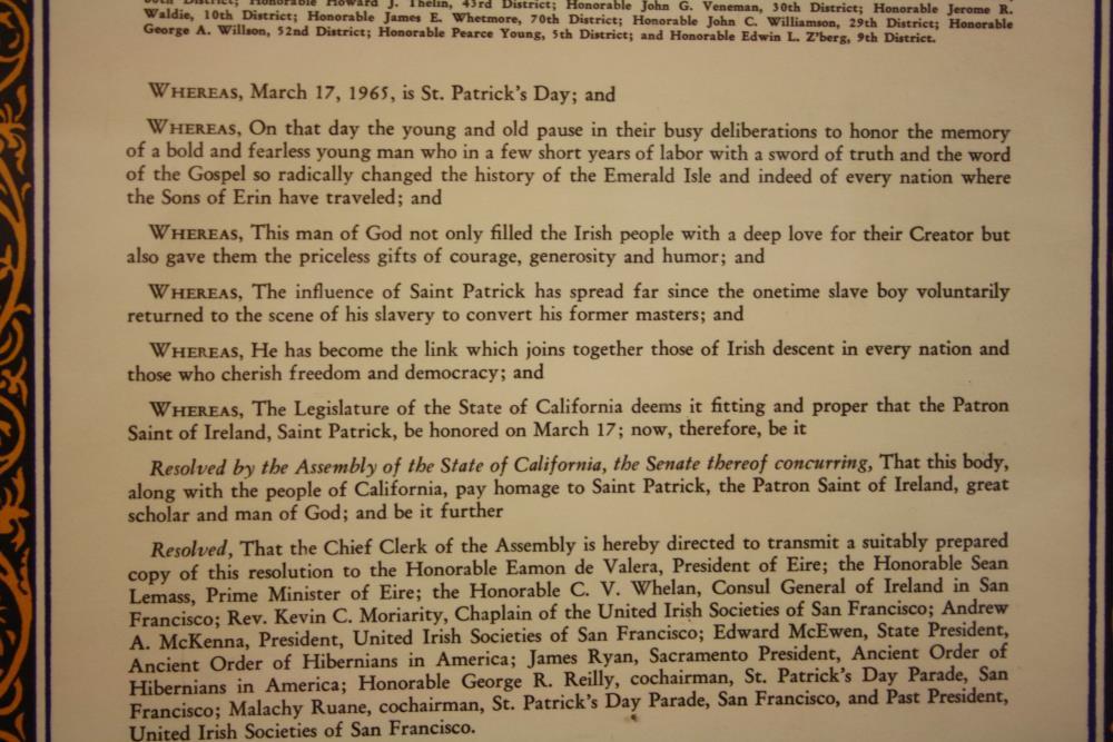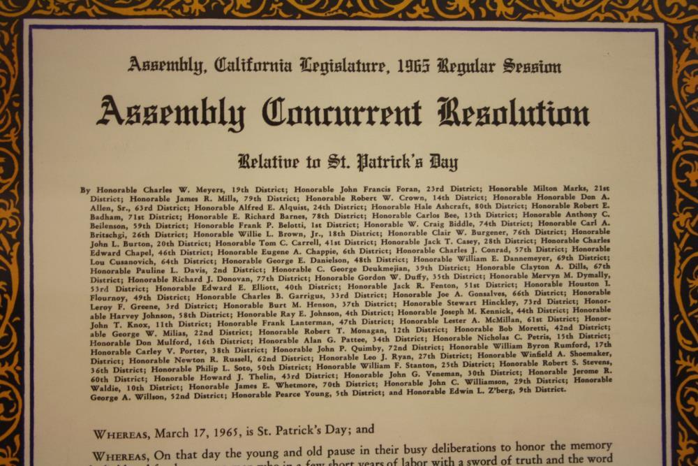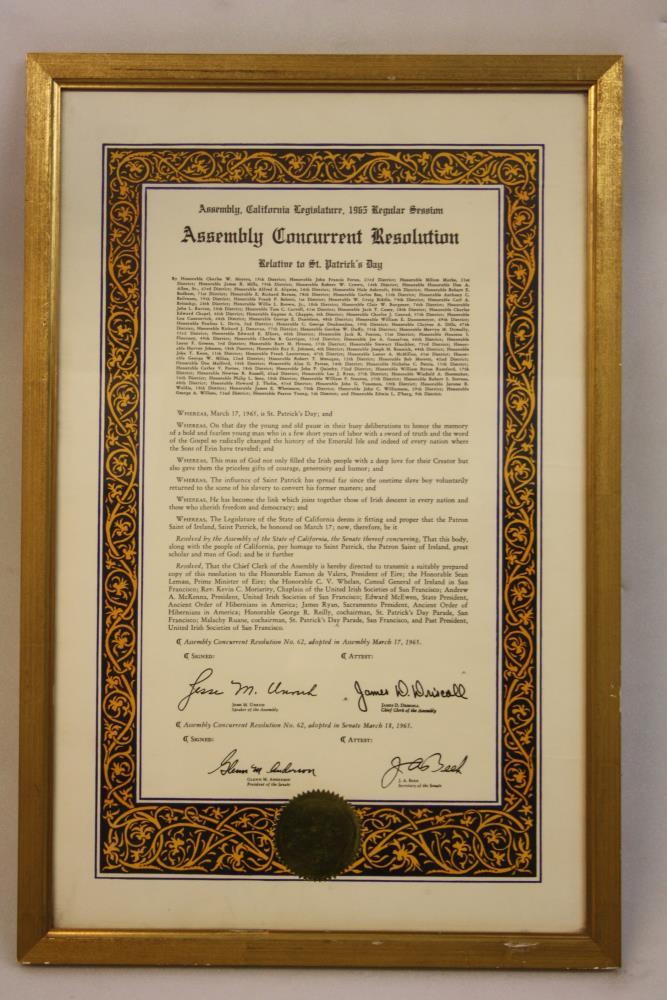 Framed document of the Assembly Concurrent Resolution Relative to St. Patrick's Day. By the Assembly, California Legislature, 1965 Regular Session. Resolution to pay homage to St. Patrick, patron saint of Ireland, Scholar and Man of God. Adopted in the Assembly on 17th March 1965, signed by Jesse M. Unrun and James D. Driscoll, and adopted by the Senate 18th March 1965 and signed by Glenn M. Anderson and J.A. Beek.;