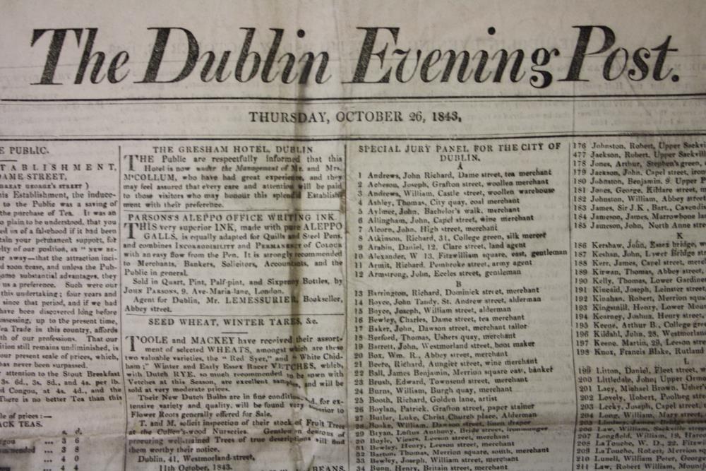 Copy of 'The Dublin Evening Post' newspaper, Thursday 26 October, 1843.;