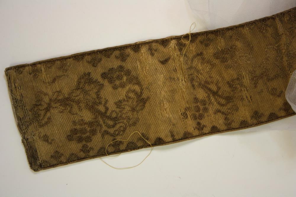 Length of textile, gold coloured with an embroidered floral pattern. Possibly a portion of a sash, or a textile from a coach. Connected to Daniel O’Connell.;