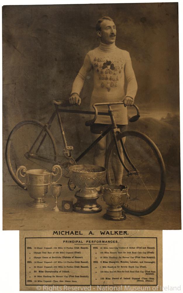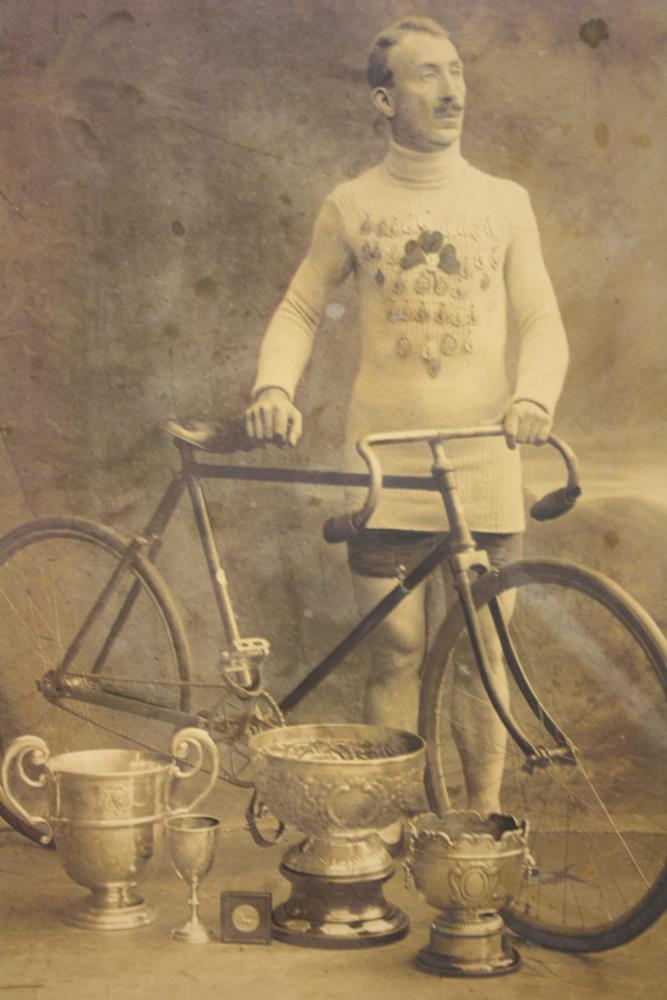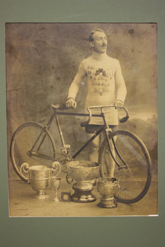 Photographic portrait, full length, of Michael Walker, road cyclist, who participated in the 1912 Olympics in Great Britain. With bicycle and trophies.;