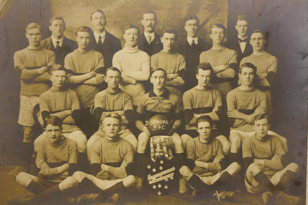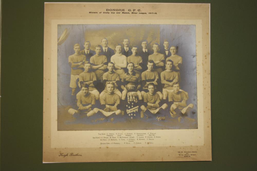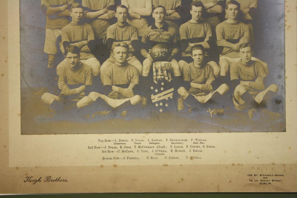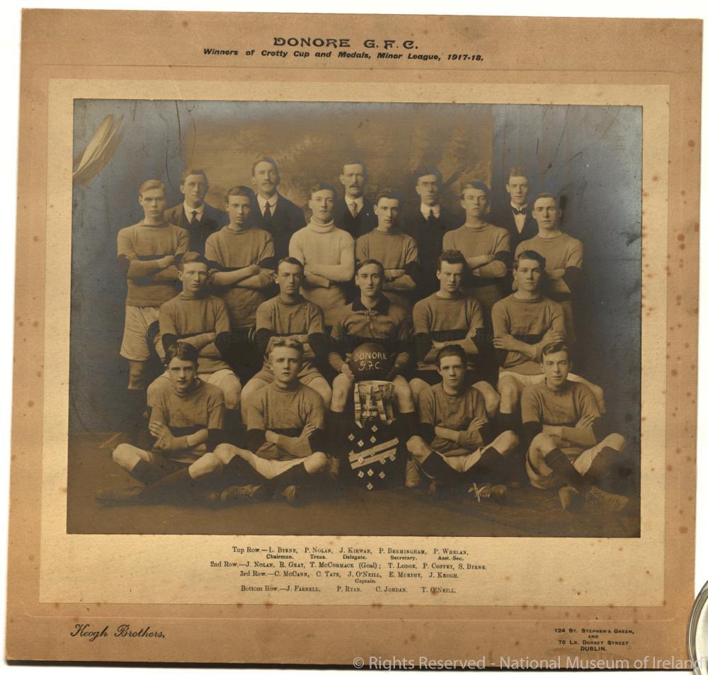 Photograph, group, black and white, by Keogh Brother of Dublin. Of the Donore Gaelic Football Club, winners of Crotty Cup and Medals, Minor League, 1917-18.;