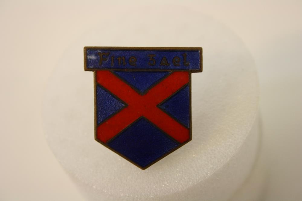 Fine Gael pin badge, c. 1935. Metal with blue enamel front, with a red cross through the centre of a blue shield under a bar bearing the letters FINE GAEL in gold.;