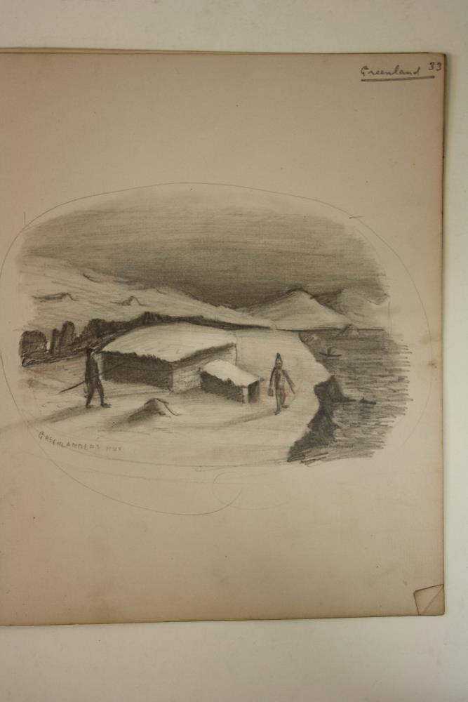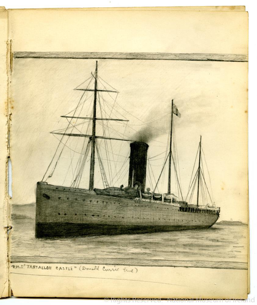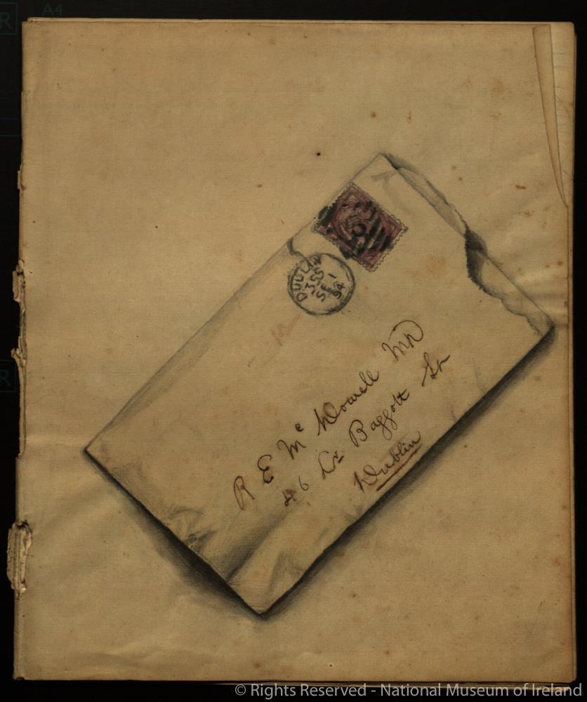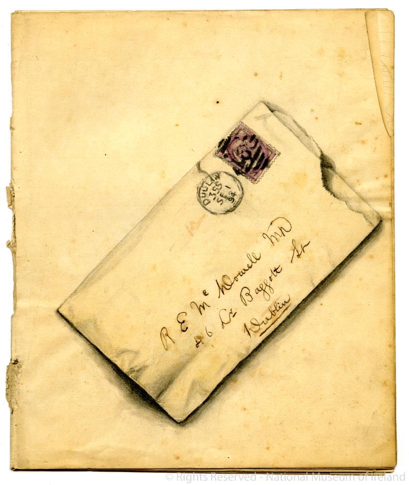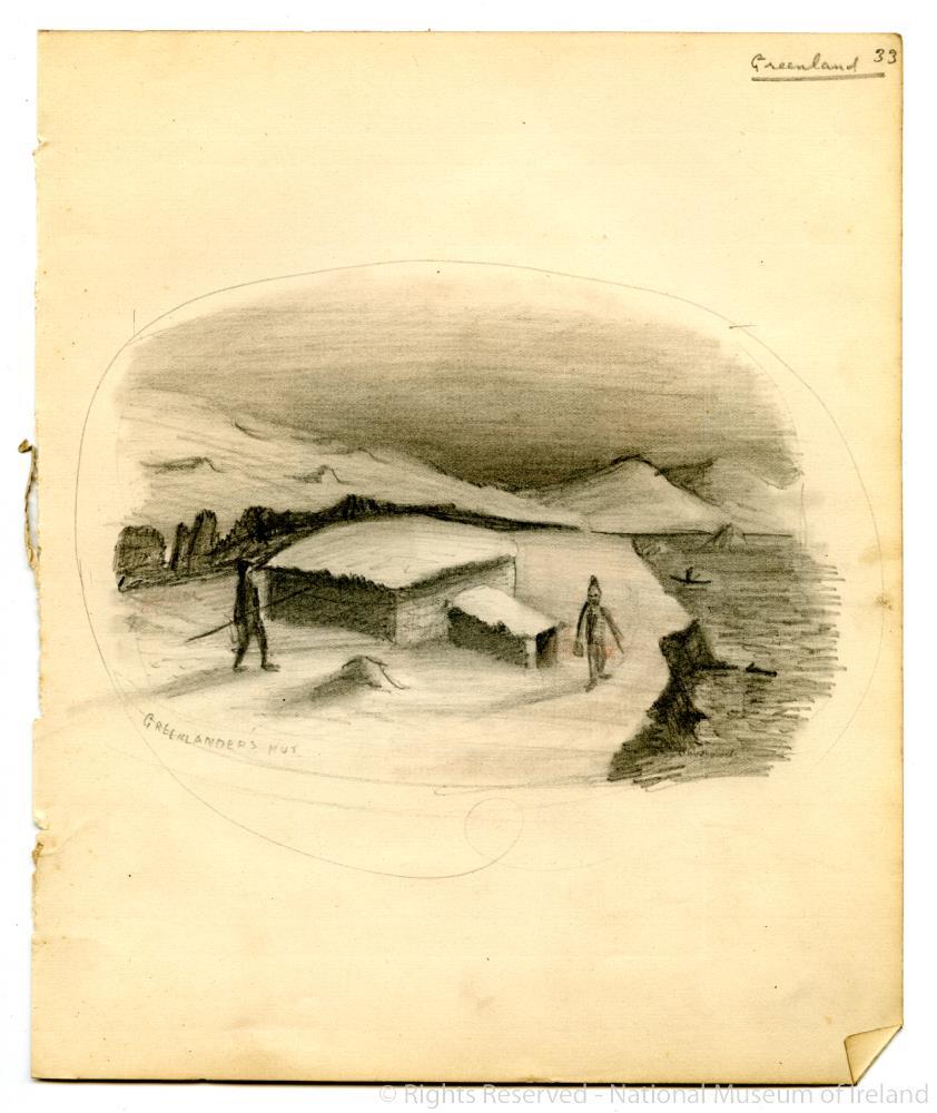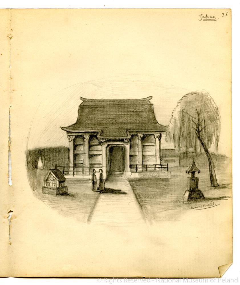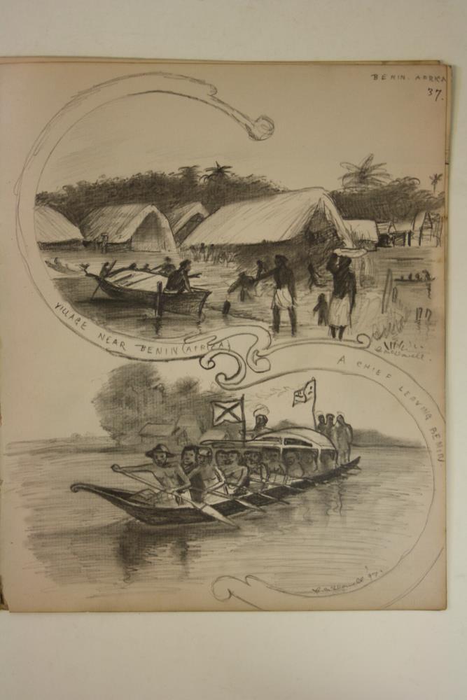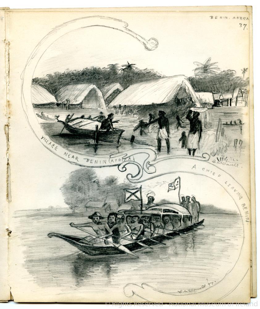 Small booklet of sketches and drawings, by Cathal McDowell. Including drawings of - An envelope addressed to R.E. McDowell at 46 Lower Baggot Street, Dublin. Face details. Steam Engine, 1856 (drawn 1899). The Royal Victoria Hospital, Montreal. Greenlanders' Hut. Japanese Temple scene. Benin, Africa; a village near Benin, and a Chief leaving Benin (drawn 1897). RMS Tantallon Castle, Donald Currie Line. Yacting scene. Found in MacDowell's photograph album, containing photographs and postcards regarding the 1916 Rising and the War of Independence.;