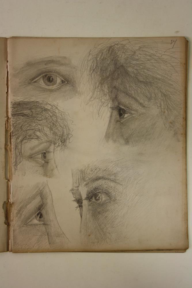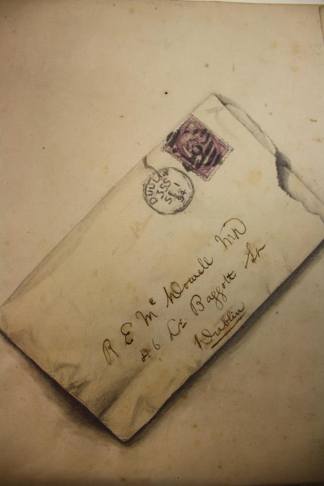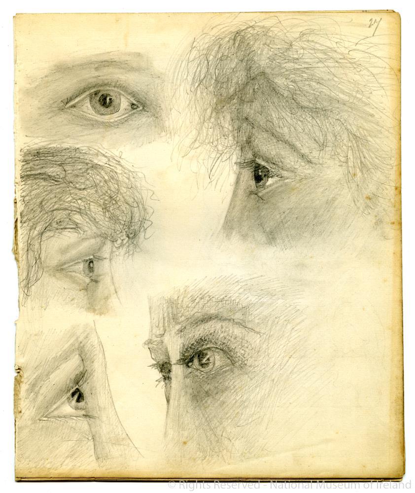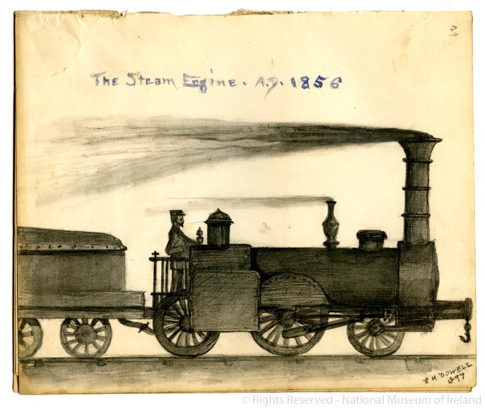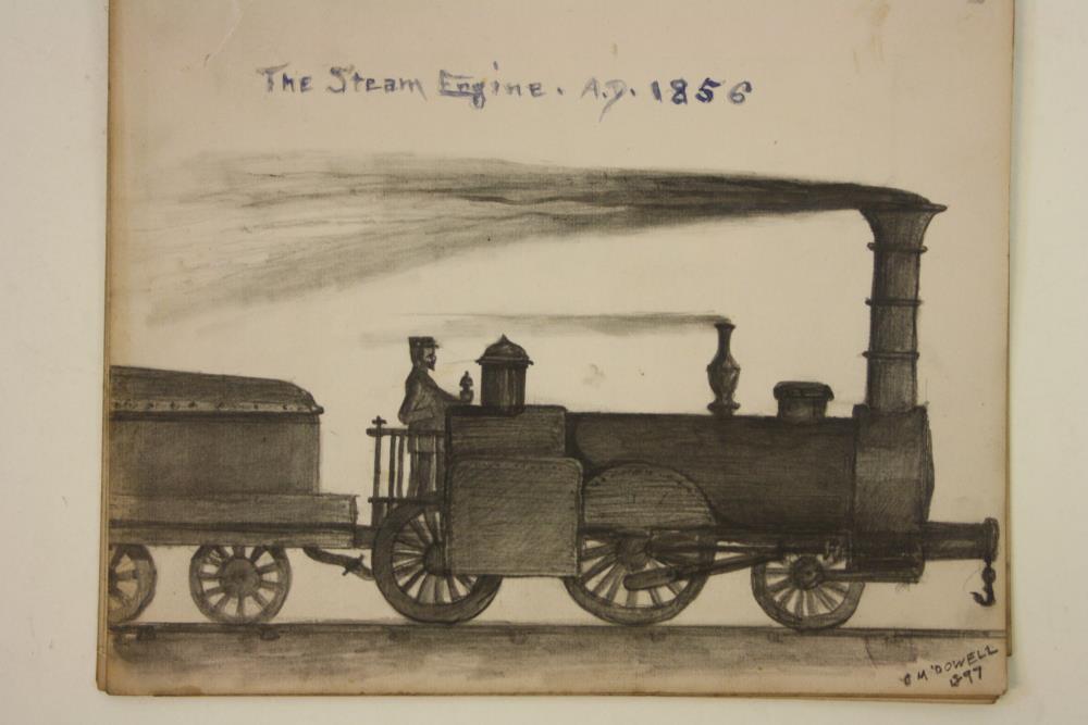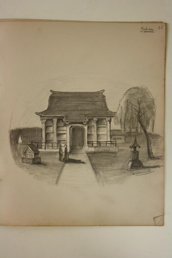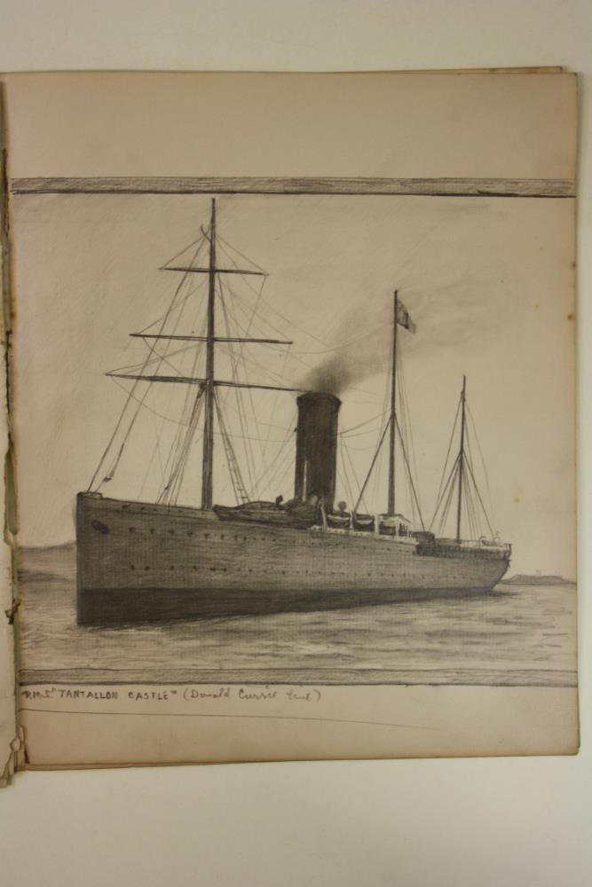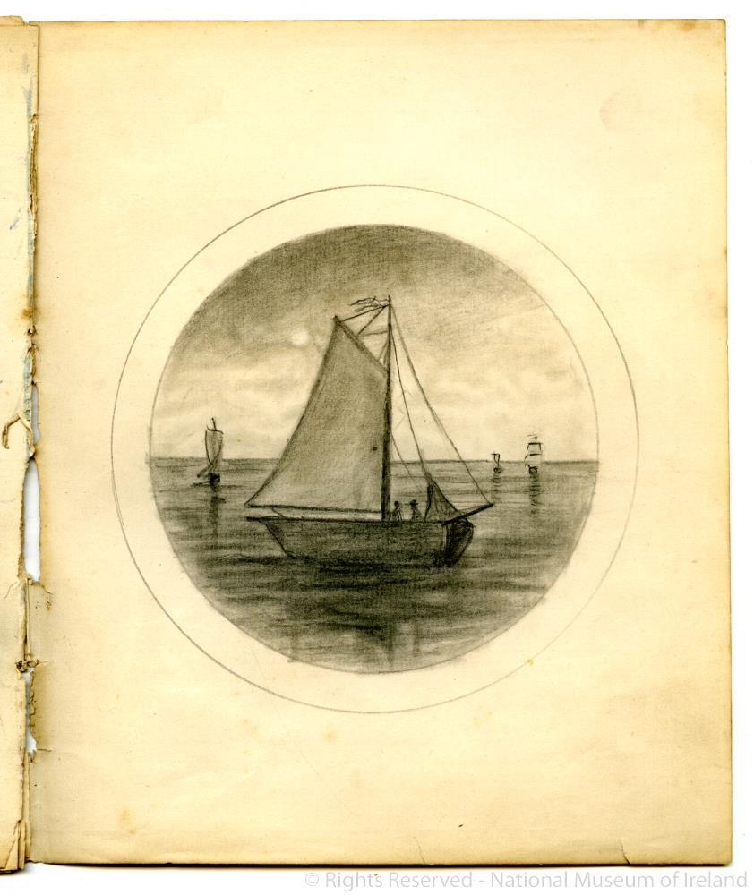 Small booklet of sketches and drawings, by Cathal McDowell. Including drawings of - An envelope addressed to R.E. McDowell at 46 Lower Baggot Street, Dublin. Face details. Steam Engine, 1856 (drawn 1899). The Royal Victoria Hospital, Montreal. Greenlanders' Hut. Japanese Temple scene. Benin, Africa; a village near Benin, and a Chief leaving Benin (drawn 1897). RMS Tantallon Castle, Donald Currie Line. Yacting scene. Found in MacDowell's photograph album, containing photographs and postcards regarding the 1916 Rising and the War of Independence.;