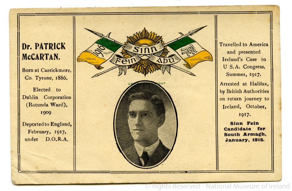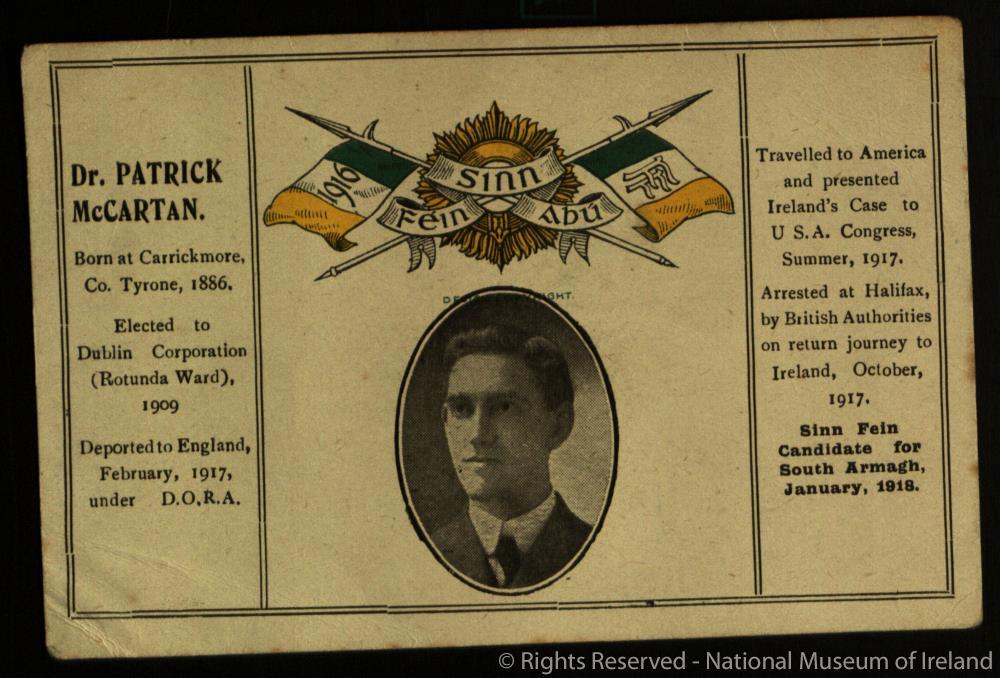 Postcard photograph; postcard for Dr. Patrick McCartan, with photograph, 'Sinn Fein Abu' emblem and biographical details. Born at Carrickmore, Co. Tyrone, 1886. Elected to Dublin Coproration (Rotunda Ward) 1909. Deported to England February 1917 under D.O.R.A. Travelled to America and presented Ireland's case to U.S.A. Congress Summer 1917. Arrested at Halifax by British Authorities on return journey to Ireland, October 1917. Sinn Fein candidate for South Armagh, January 1918. Postcard printed by The Gaelic Press, 30 Liffey Street, Dublin.;