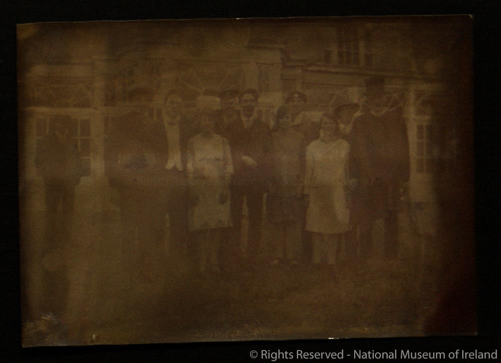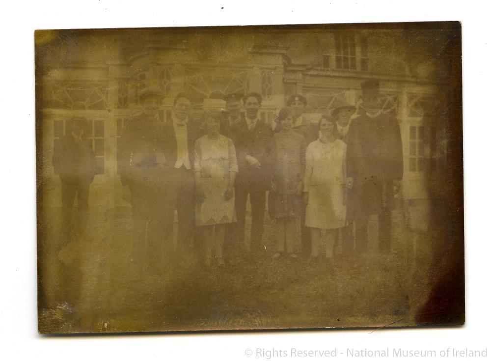 Postcard photograph; Group, male and female, posed. Possibly domestic staff, outside a large house. No details. Found in small black envelope.;