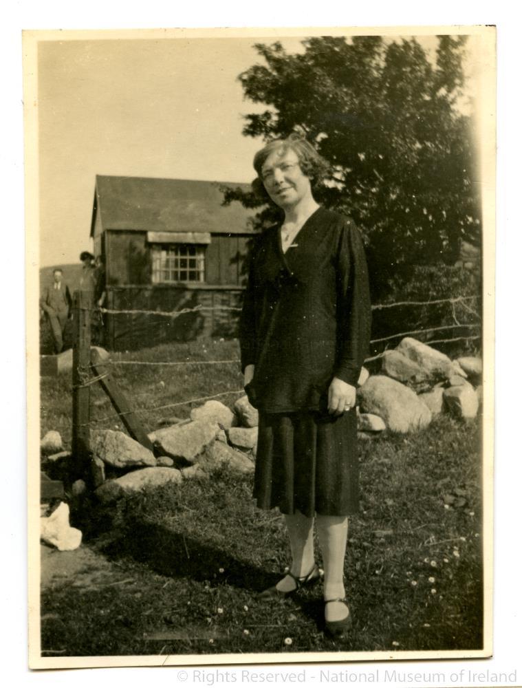 Postcard photograph; Woman, posing for photograph at a barbed wire fence, hut with people visible in the background. Probably 1920s. No details.;