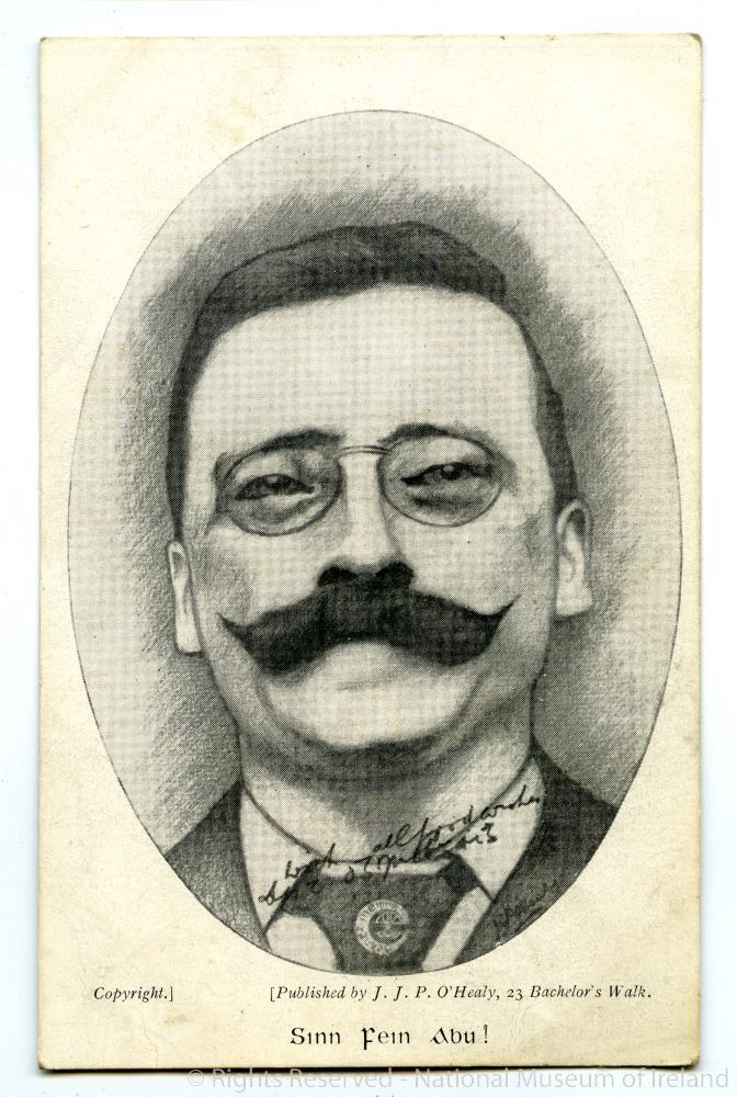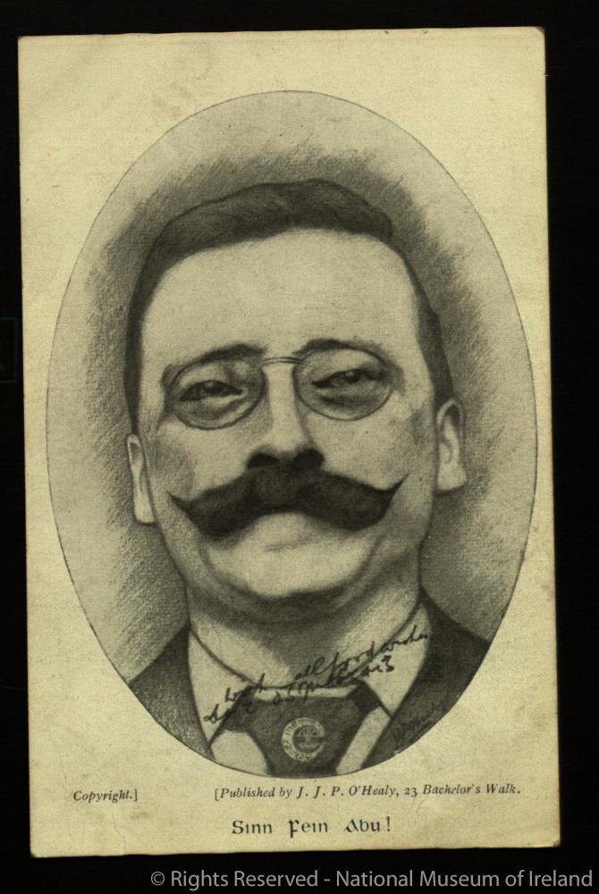 Postcard drawing; sketch or drawing of Arthur Griffith, head in portrait, with printed signature in Irish, 'with all good wishes'. 'Sinn Fein Abu' underneath. Visible on his necktie is the Deanta in Eireann emblem. Published by J.J. P. O'Healy, 23 Bachelor's Walk, Dublin.;