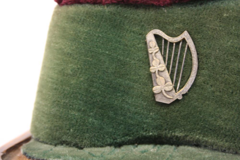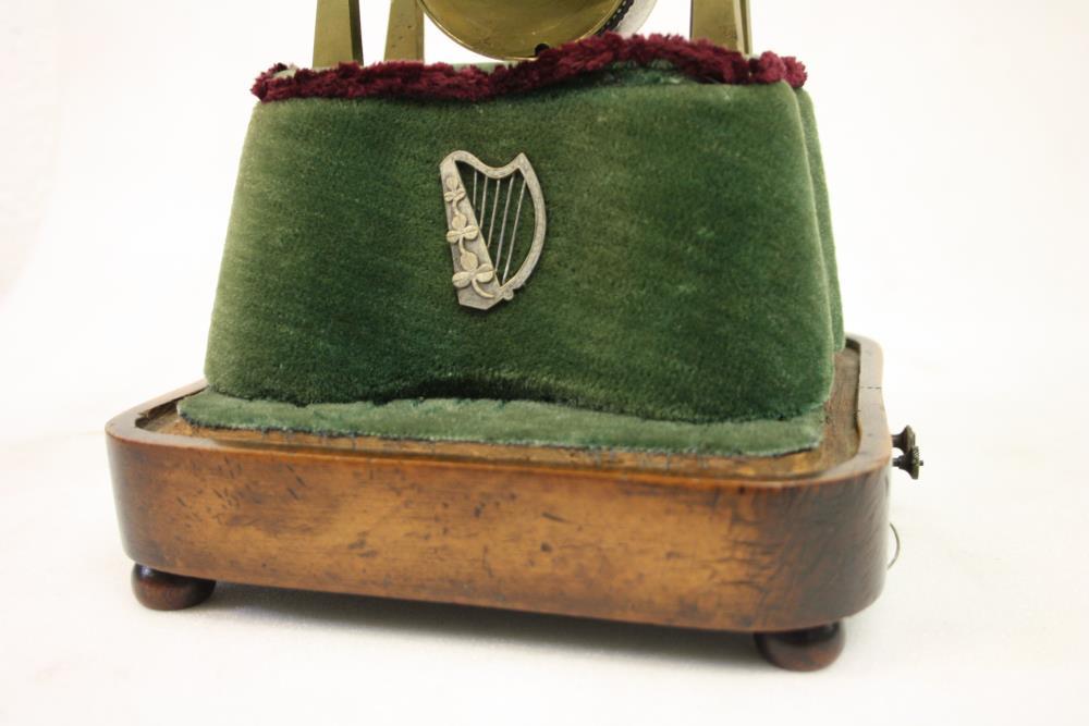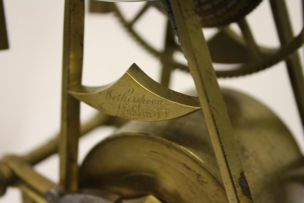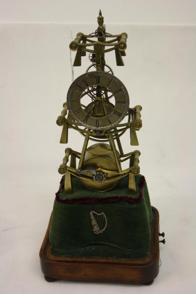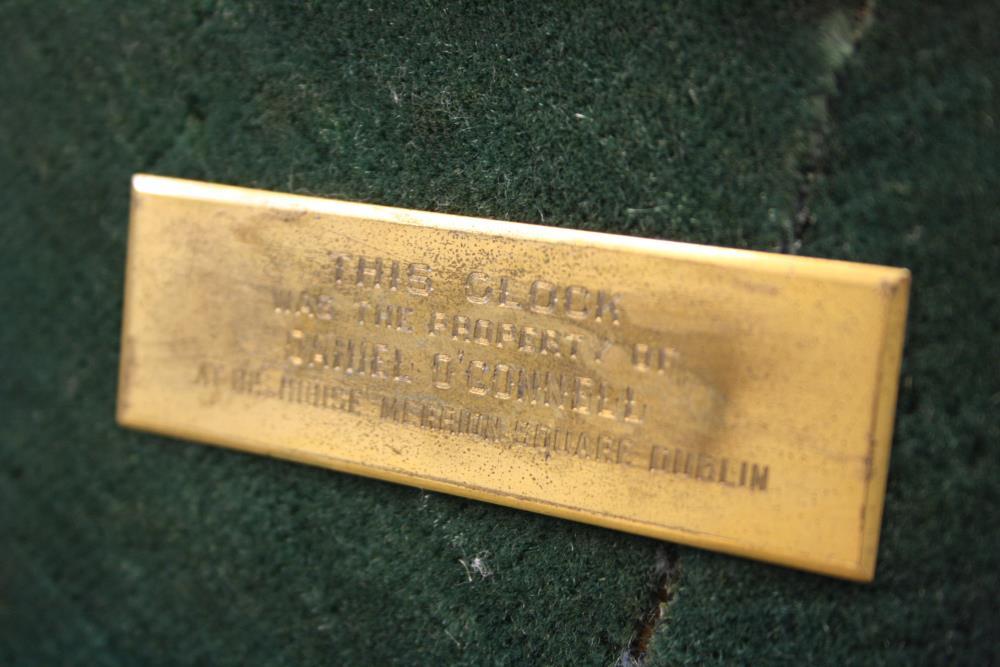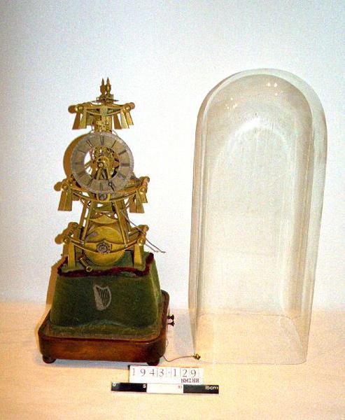 Clock, which belonged to Daniel O'Connell. Engraved on a plate at the back 'This clock was the property of Daniel O'Connell at his house, Merrion Square, Dublin'. Skeleton clock, by Wotherspoon of Dublin, c.1839. With lever escapement, movements uncovered and supported on an ornamental brass framework, on a wooden pedestal covered in green pluch. Music box, probably French, in the pedestal. With glass dome. Total height 16.5 inches.;