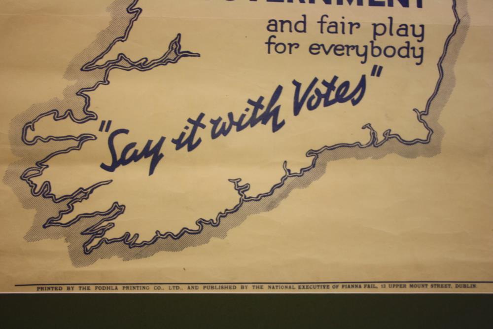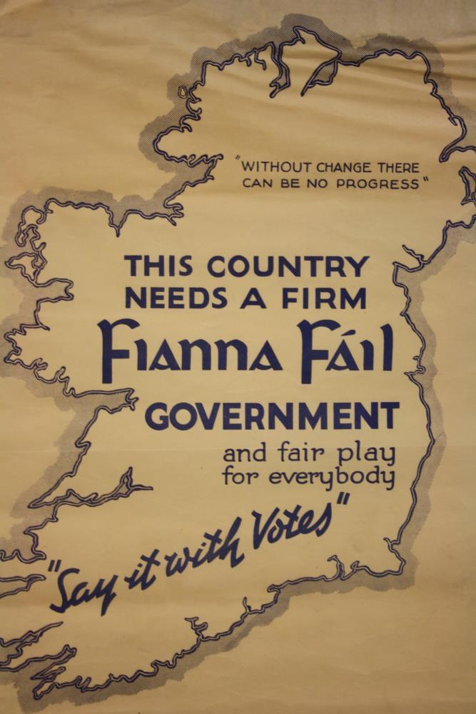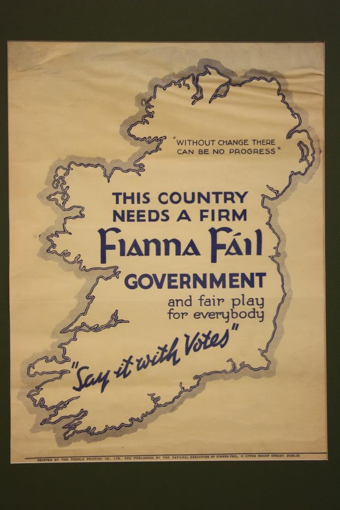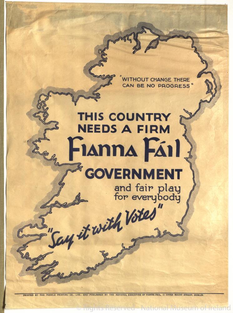 Fianna Fáil election poster. Depicts a map of Ireland, with the text 'This country needs a firm Fianna Fail Government, and fair play for everybody / Say it with Votes'. 1932 General Election. By Fodhla Printing Co., Ltd., Dublin.;