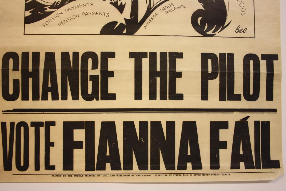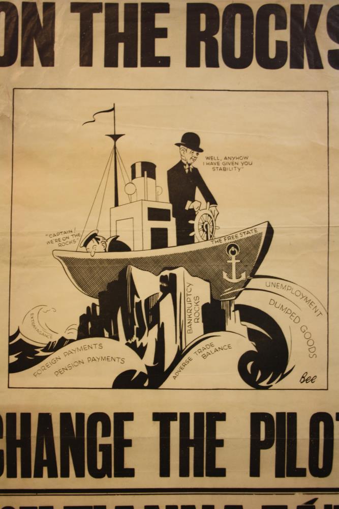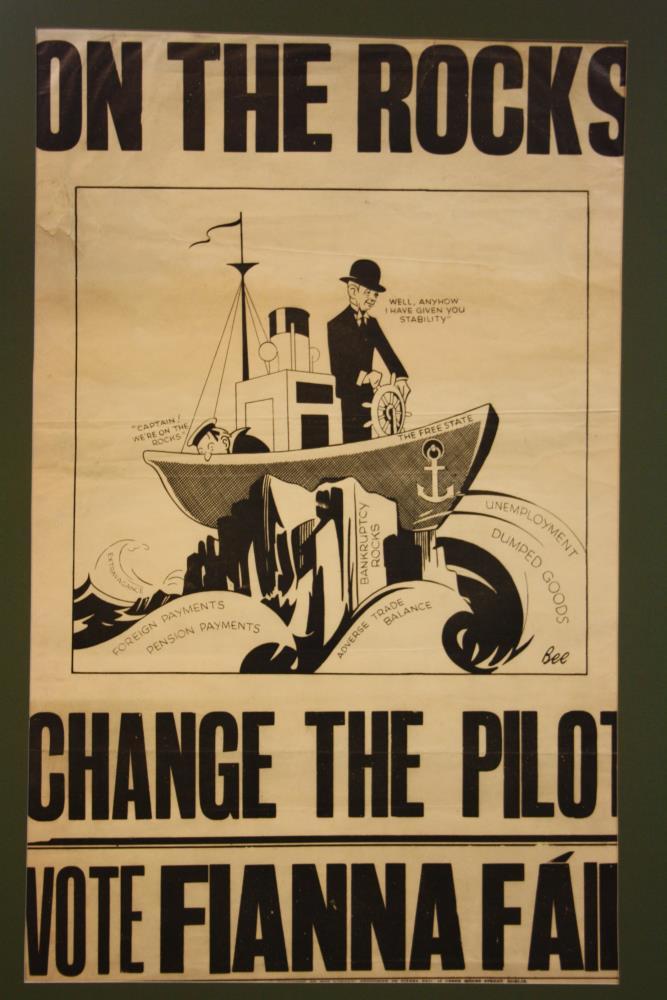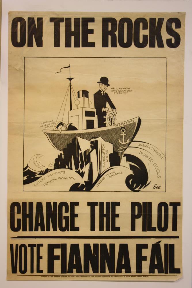Fianna Fáil election poster, 1930s. Probably the 1932 General Election. 'On the Rocks / Change the Pilot / Vote Fianna Fail'. By Fodhla Printing Co., Ltd., Dublin.;