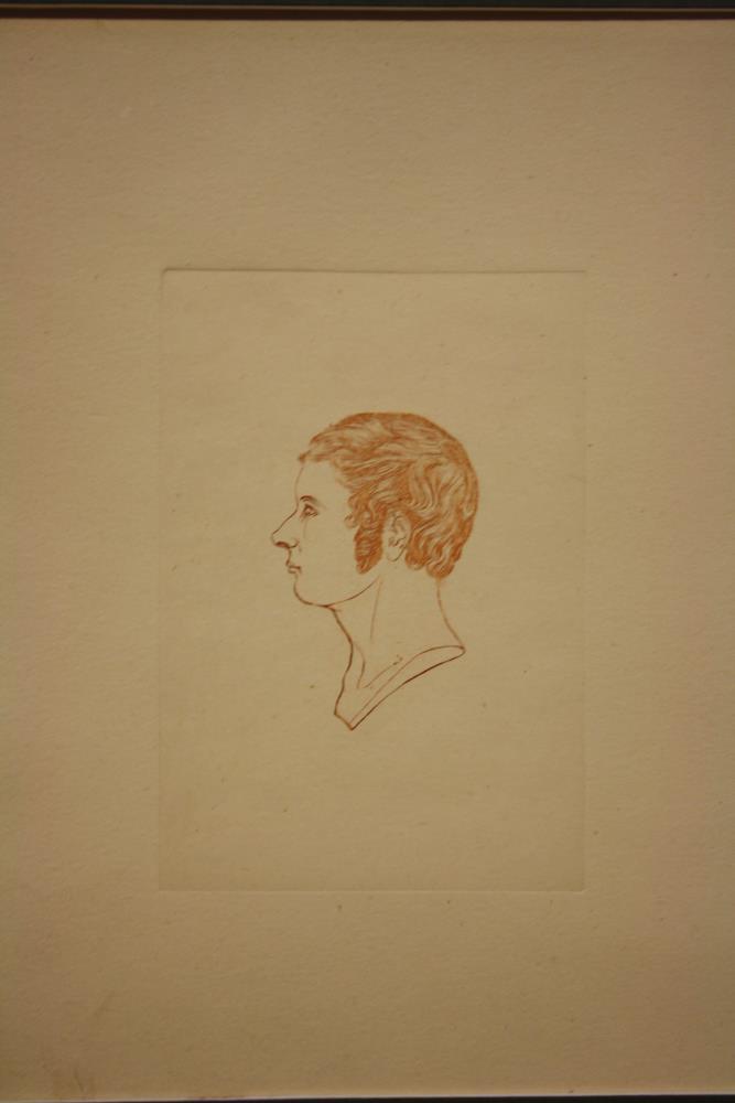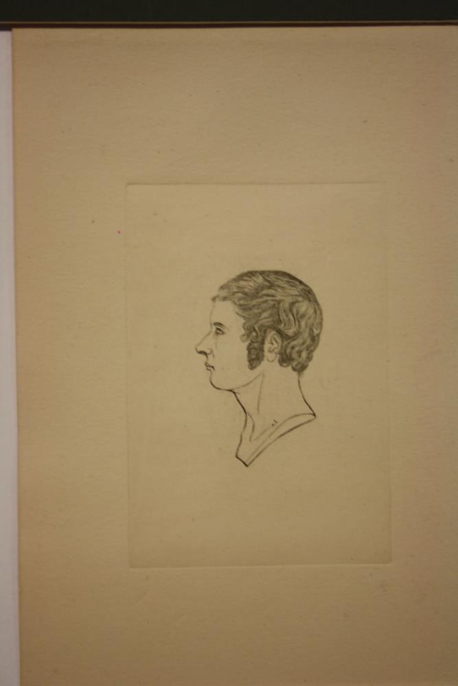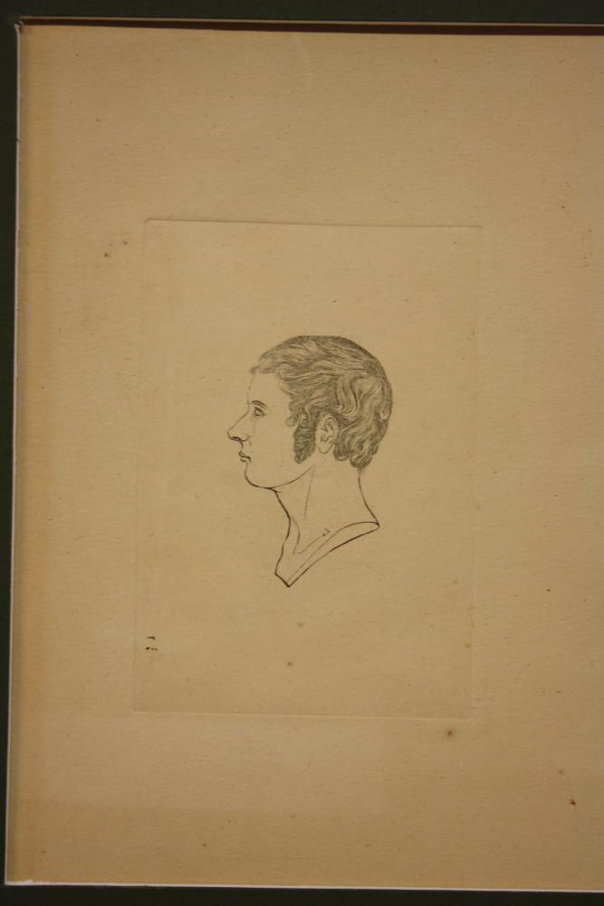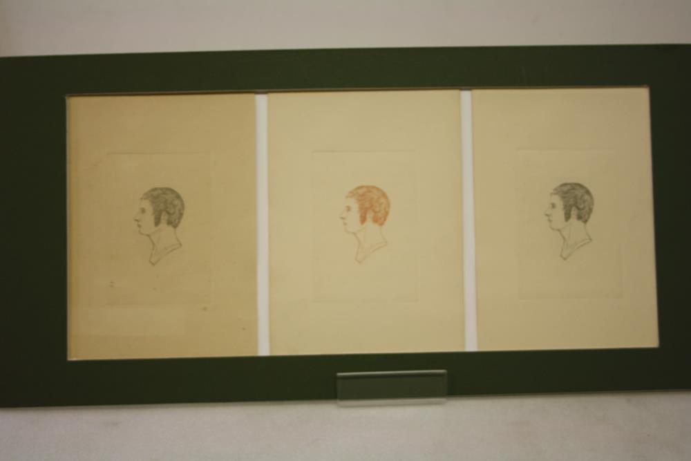 Three miniatures, or drawings, of a male in profile. Framed. Copper plate etchings of William Mossop. Head in outline to the right.;