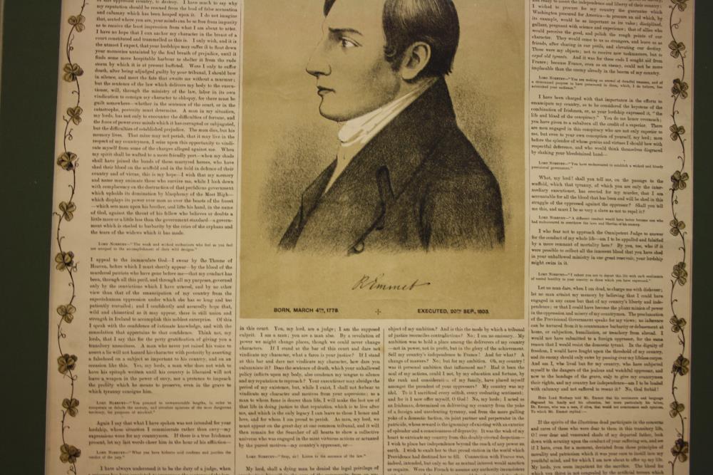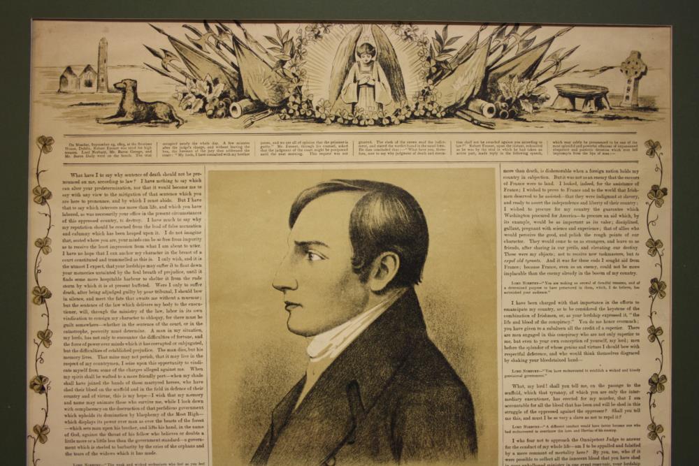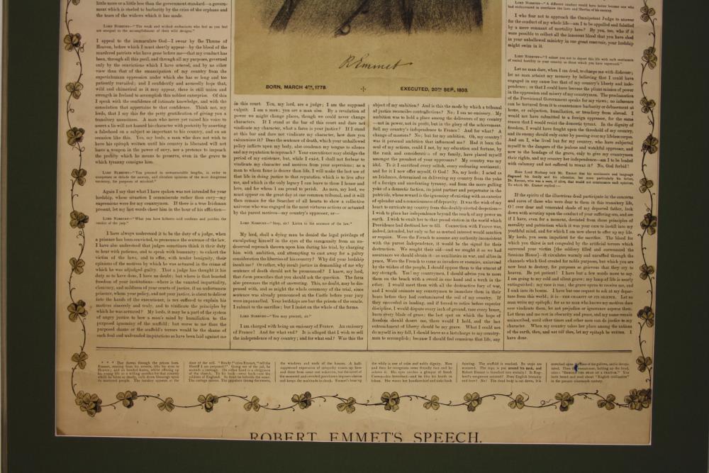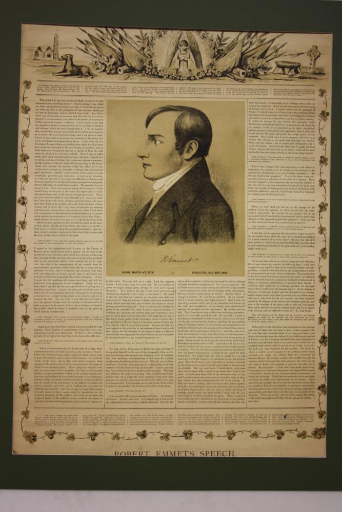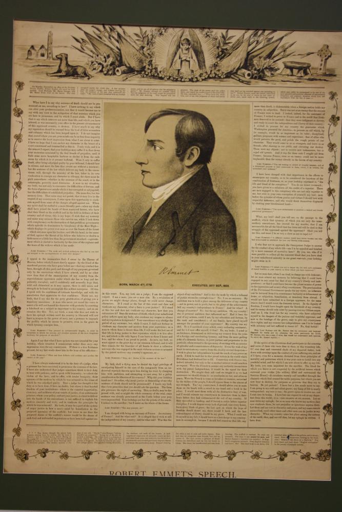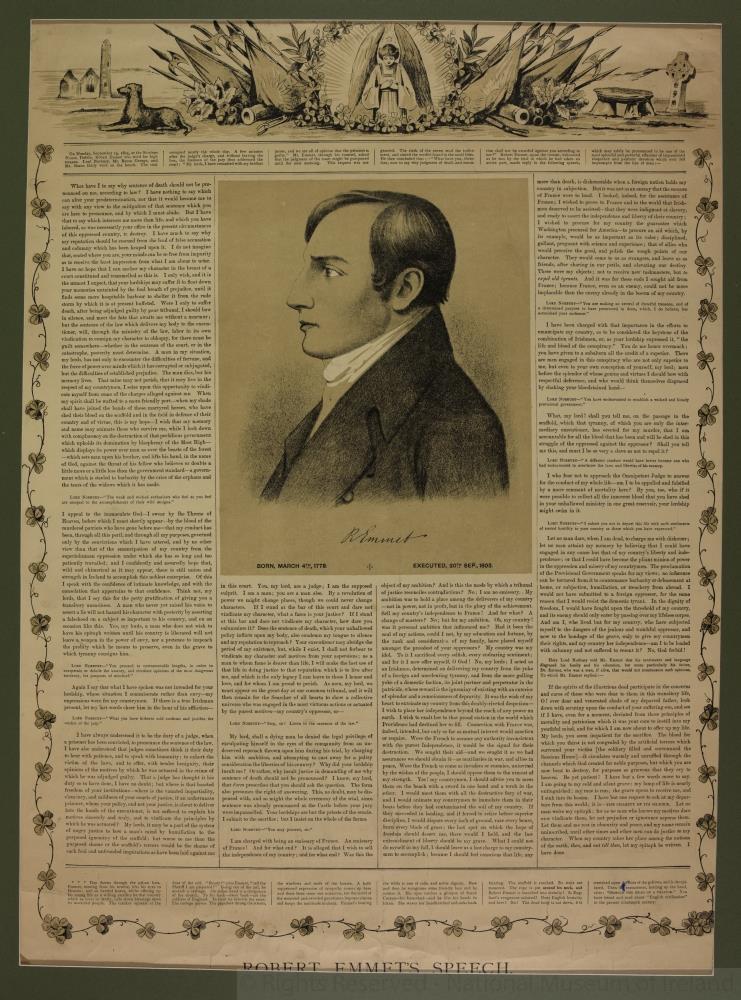 Print, Robert Emmet's Speech. Portrait of Robert Emmet, with his address from the dock, to commemorate the 1898 centenary of the rebellion.;