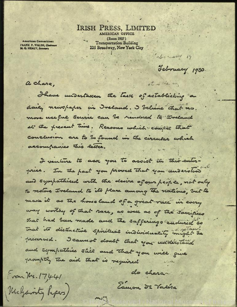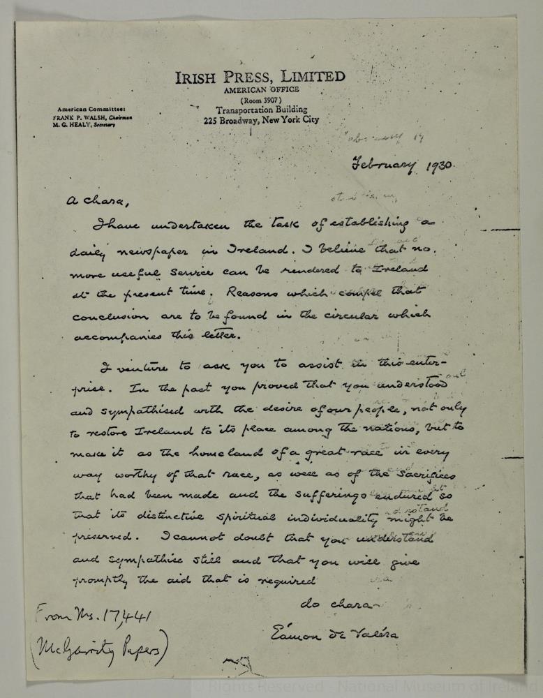 Letter from Eamon de Valera in relation to the Irish Press. Dated February 1930. This letter is a copy of one held in the National Library.;