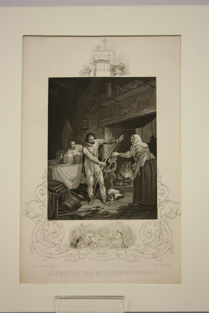 Print, or illustration, 'Alfred in the Neathherd's Cottage' (Alfred inthe Danish Camp). Painting by F. Wheatley R.A. Engraved by J. Rogers.;