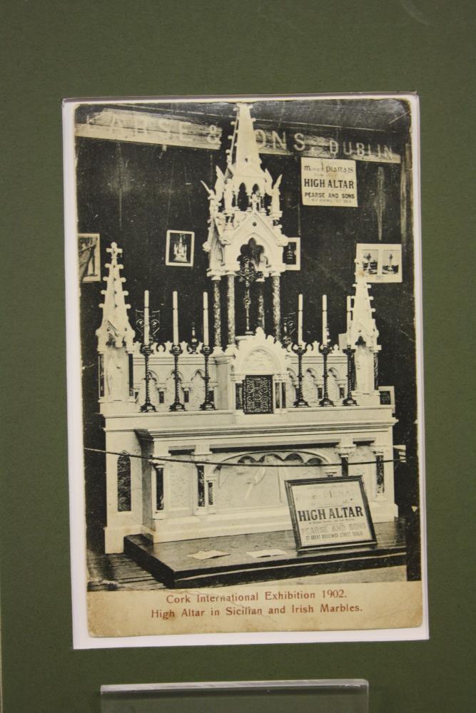 Postcard photograph in black and white of a church altar with signs hung about it bearing the name 'High Altar, Pearse and Sons, 27 Great Brunswick St. Dublin'. On the reverse, a handwritten note by William Pearse to a Mr. Sharpe. The postcard shows an altar exhibited by the Firm at the Cork International Exhibition.;