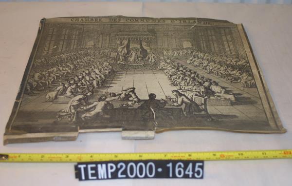 A print of an engraving with the heading "Chambre de Communes d'Irlande" printed over it.;