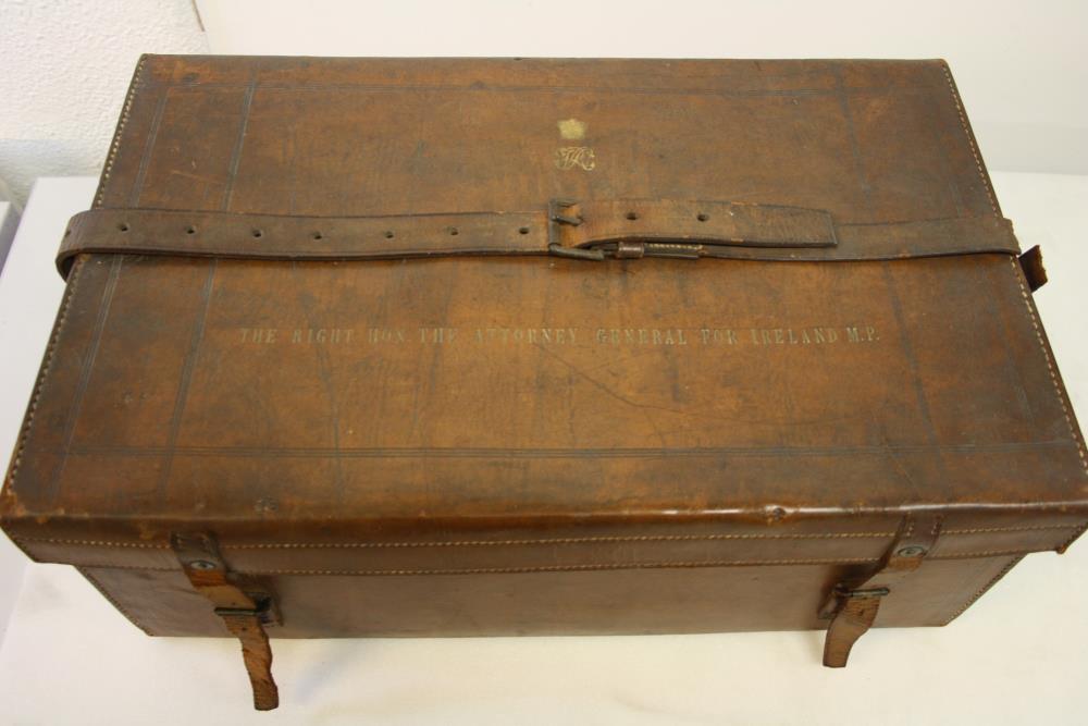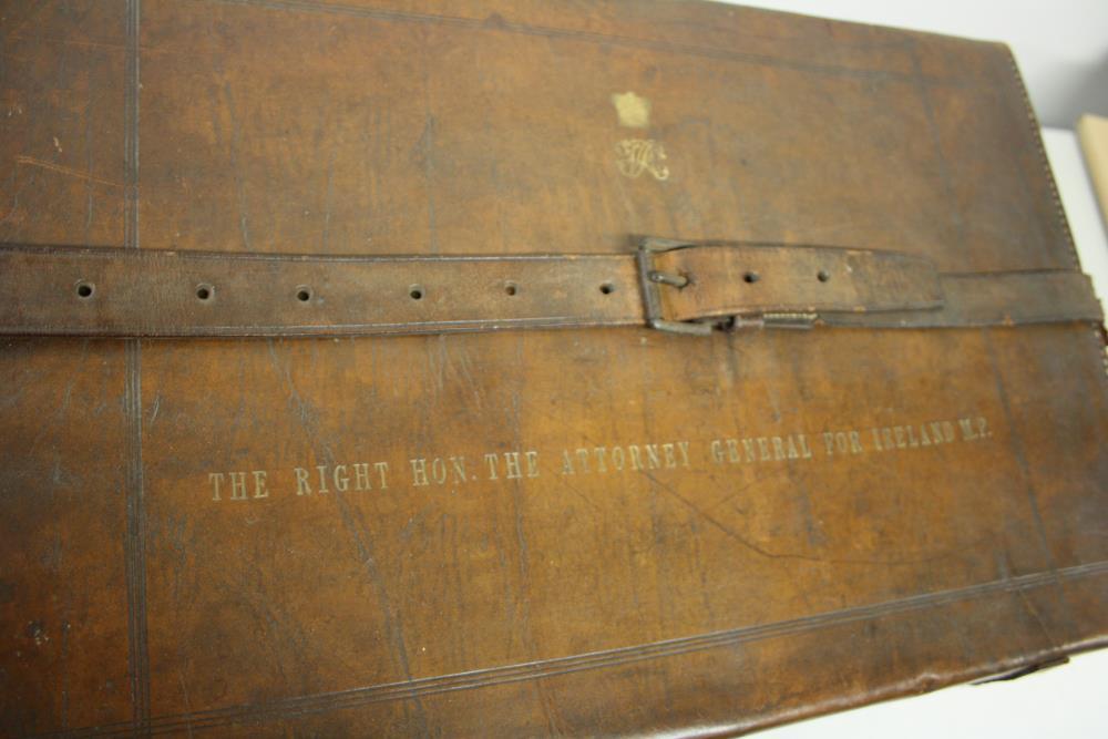 Attorney General's travel case. Leather case, brown, with a leather strap across the top. 'The Right Hon. The Attorney General of Ireland M.P.' stamped in gilt across the top, along with a crowned VR motif.;
