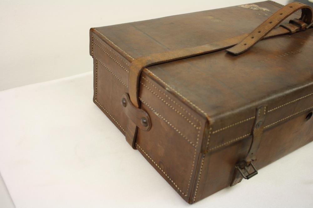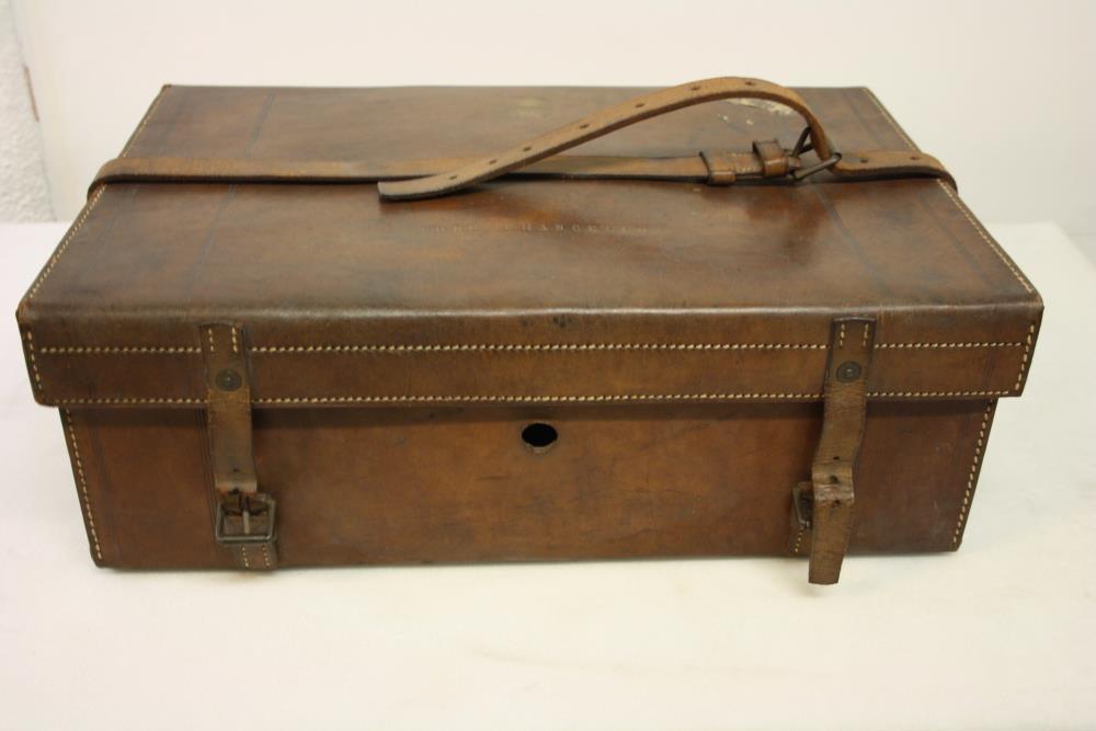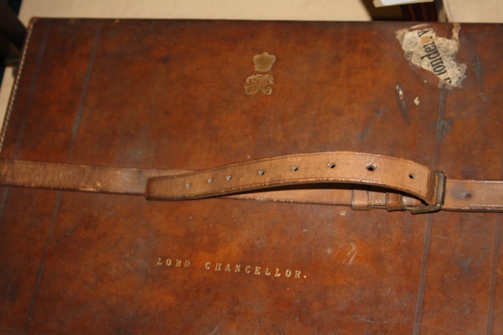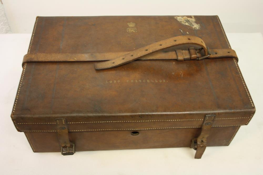 The Lord Chancellor's travel case. Stiff end leather rectangular small case with leather straps and brass clasps. "Lord Chancellor" is engraved in gold on the lid and the Royal insignia.;