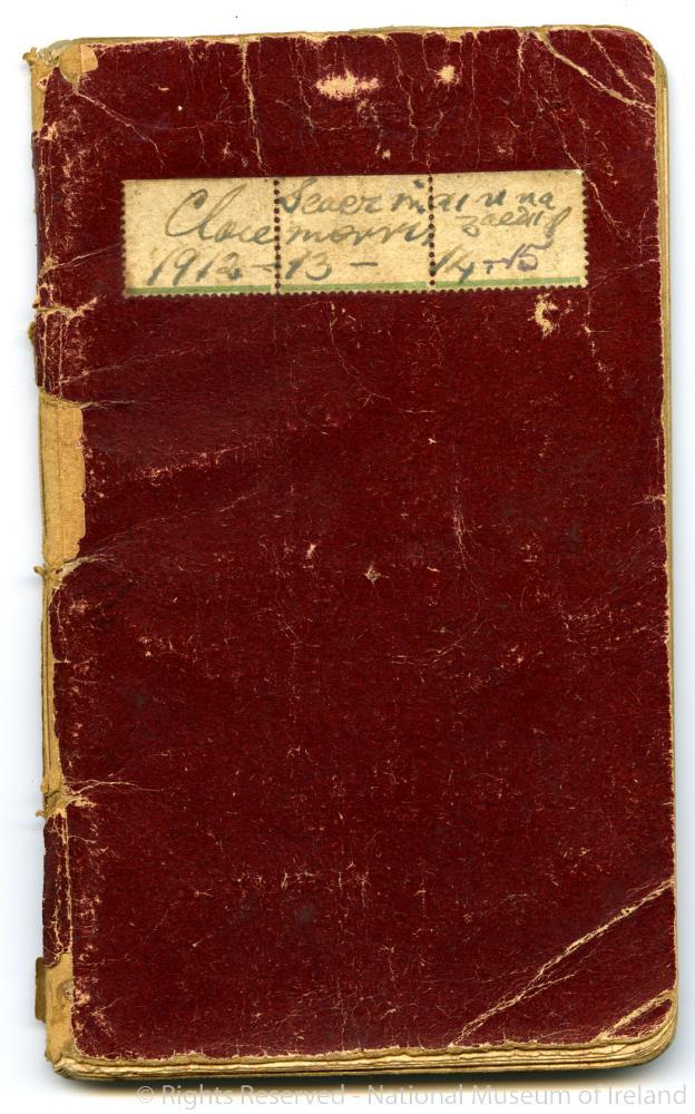 Small red pocketbook. Ledger containing Gaelic League newspaper clippings. Claremorris 1912, 13, 14, 15;