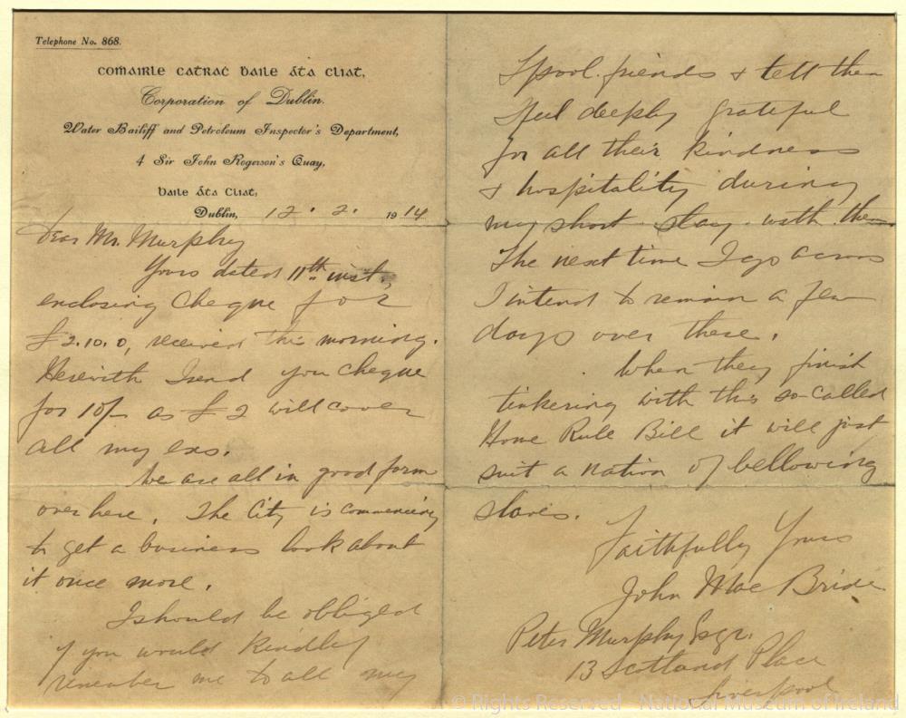 Letter on Corporation of Dublin headed paper, from John MacBride to Peter Murphy dated 12 February 1914.;