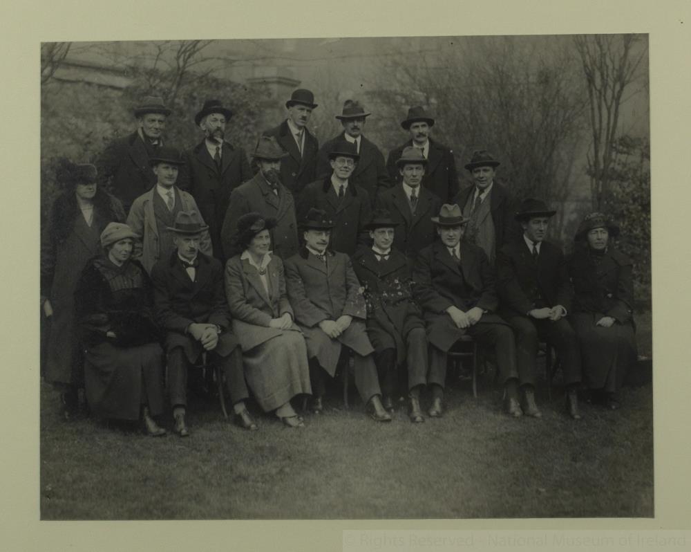 Photograph of group, front row seated, including Michael Collins, Eamon de Valera, Arthur Griffith, Harry Boland and Countess Markievicz.;