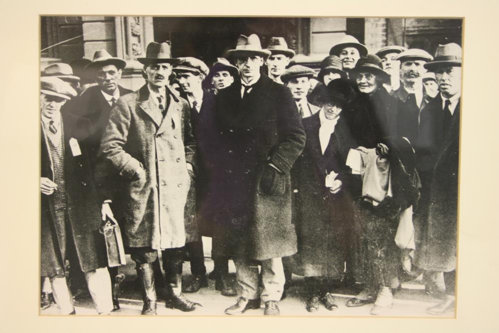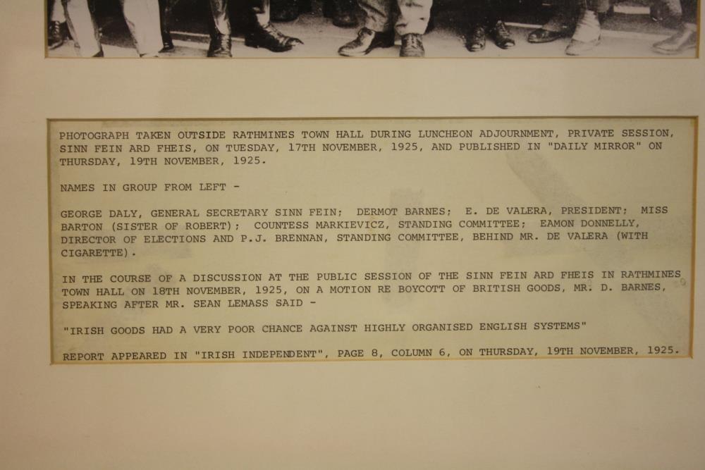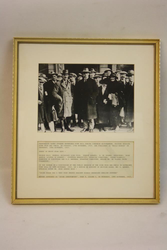 Framed photograph and caption. Photograph depicts group of people, include de Valera outside the Rathmines Town Hall during luncheon adjournment of the private session of the Sinn Fein Ard Fheis, on 17th November, 1925, where the boycott of British goods was discussed. Published in the Daily Mirror and the Irish Independent, 19 November 1925.;