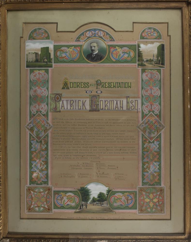 Certificate given to Patrick Gorman on behalf of the Dublin Pawnbrokers Assistants. A large hand painted text with illustrations. It reads, "Address and Presentation to Patrick Gorman Esq.". Along the bottom it reads "Designed and Illuminated by Alice M. O' Rourke". The text is framed with Celtic designs with a green background, and is headed by a drawing of a man with a moustache, presumably Mr. Gorman, wearing a three piece suit and tie. A square on each corner, the two at the top with landscape pictures, the two on the bottom with more Celtic designs.;