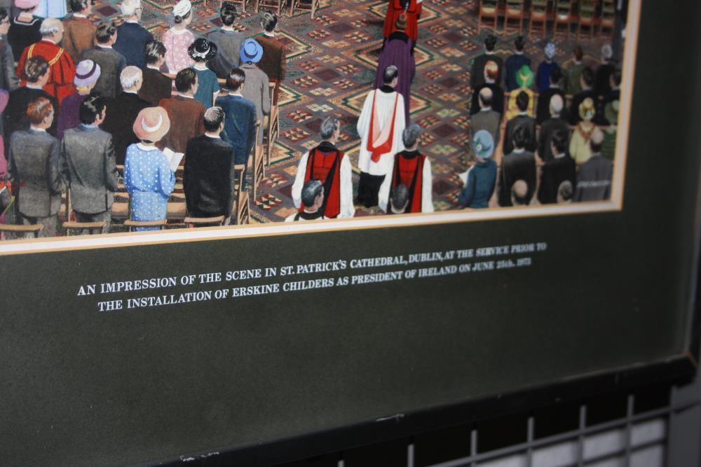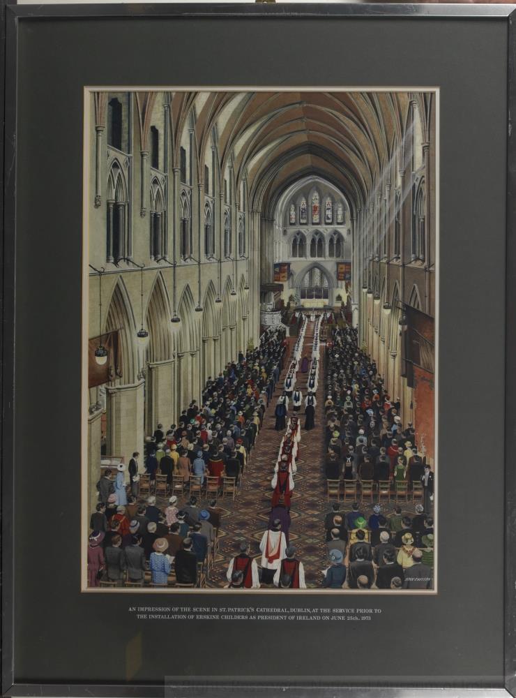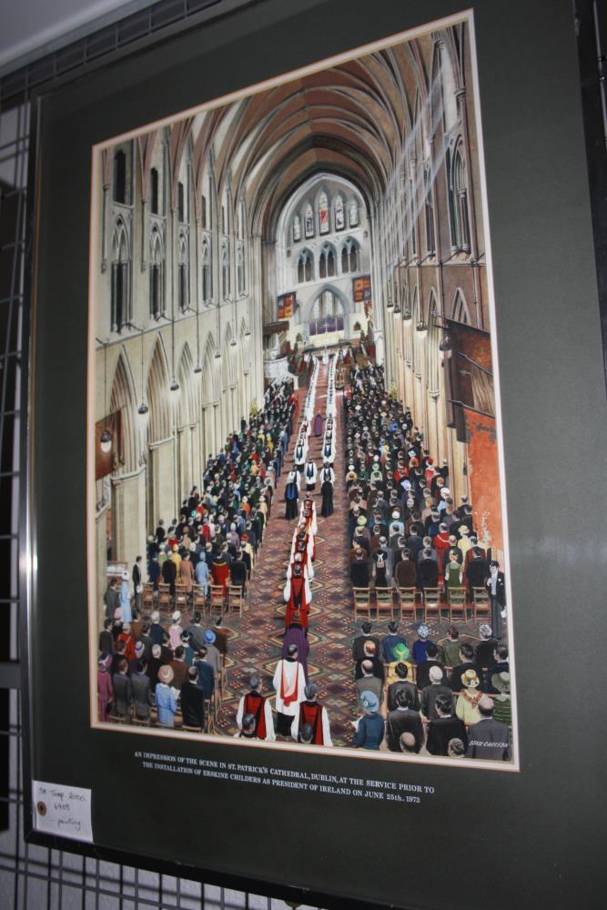 Painting of interior of St. Patrick's Cathedral. Large congregation, all standing, as the procession moves up the aisle. Signed, "Stan Davison". Along the bottom of the frame it reads, "An Impression of the Scene in St. Patrick's Cathedral, Dublin, at the Service Prior to the Installation of Erskine Childers as President of Ireland on June 25th, 1973".;
