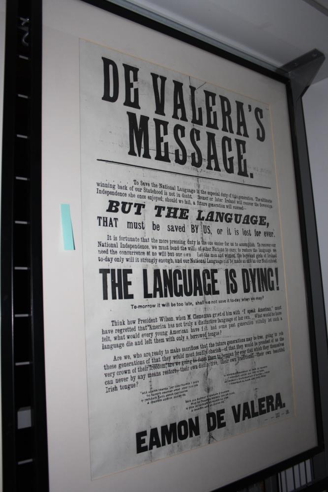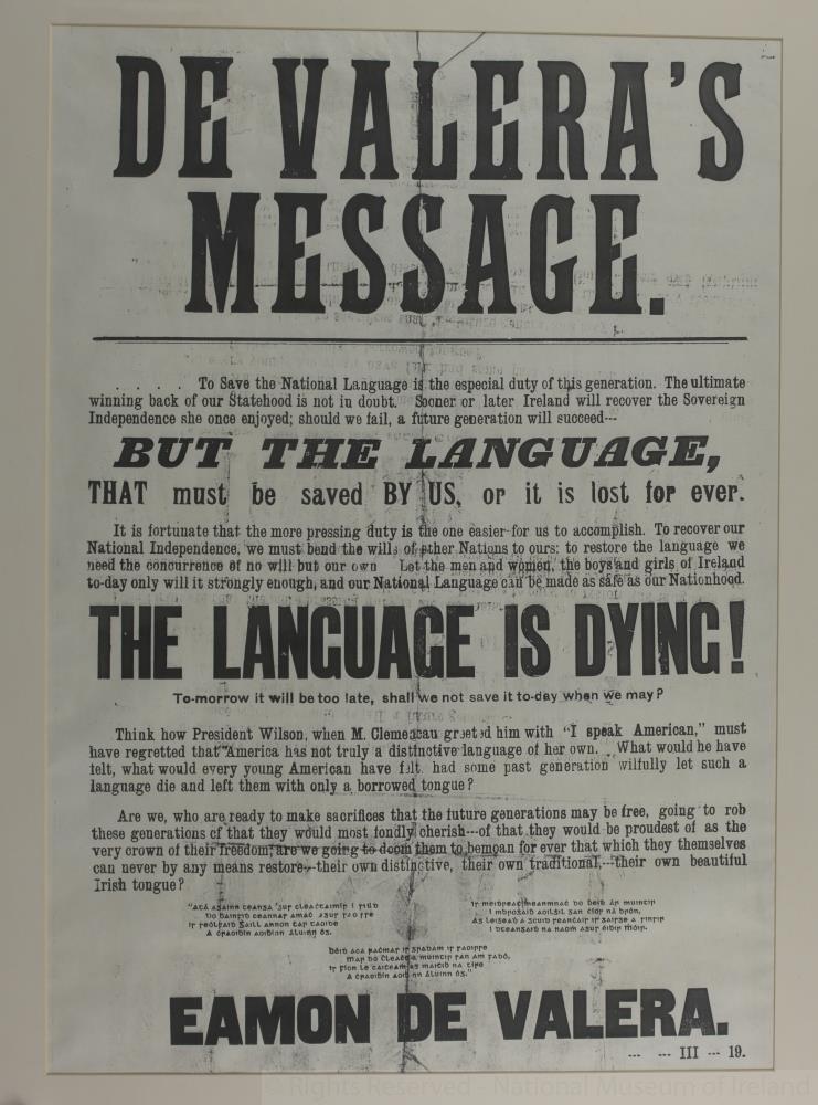 Large framed poster, in black and white print. The headline reads, "De Valera's Message", with a subheading, "The Language is Dying!". It ends with the name "Eamon De Valera" below which are the numbers III 19. Probably c. 1932.;