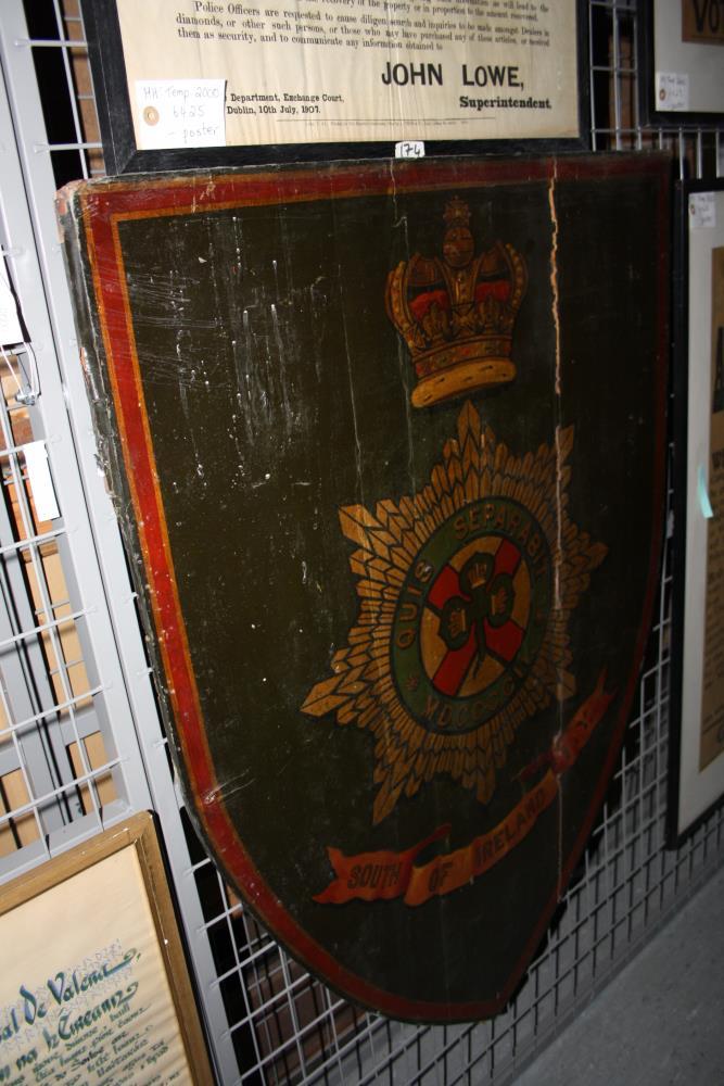 Large painted coat of arms. On it, it reads, "South of Ireland I. Y. ". The crown sits at the top of the crest, and below this is the badge with the logo of three crowns on a shamrock which is surrounded by the words, "Quis Separabit MDCCCCII". Dark brown in colour with a border of maroon, which has a gold coloured border of its own.;