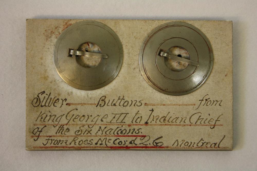 One of a pair of silver buttons (HH:1995.102.1& .2); from King George III to Indian Chief of the Six Nations. From Ross McCord, 2.6 Montreal. Circular, with hole in centre and clip attached to reverse.;
