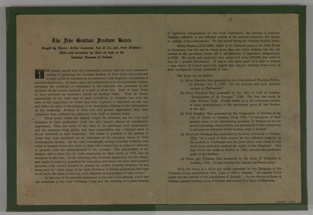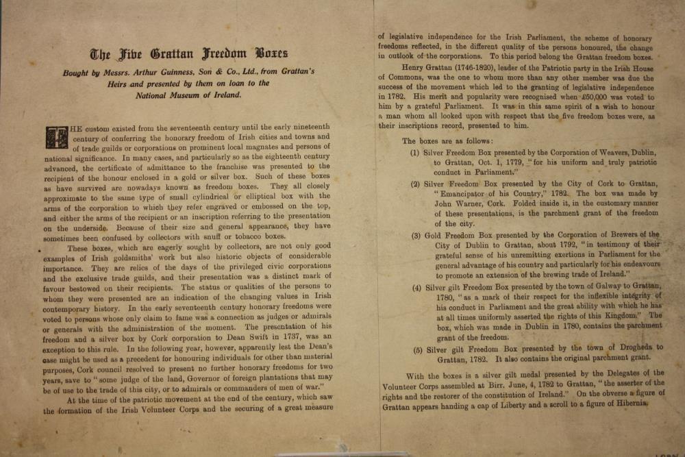 Print, text with information on 'The Five Gratton Freedom Boxes', which were bought by Messrs Arthur Guinness, Son & Co. Ltd. from the Grattan Heirs, and presented by them on loan to the National Museum of Ireland.;