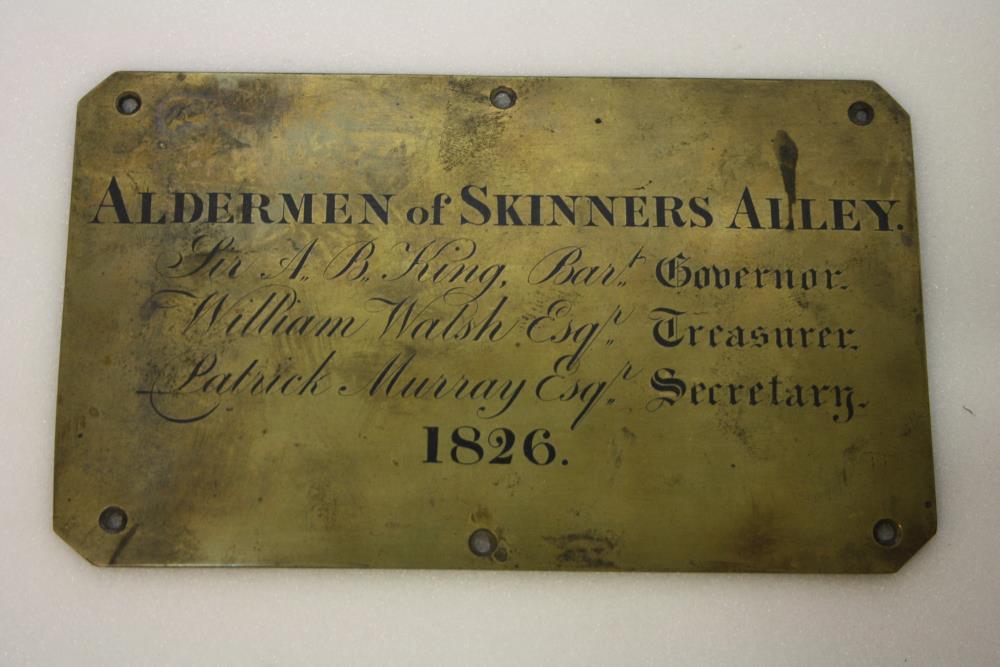Regalia of the Corporation of Skinner's Alley. Brass name plate, reading 'Aldermen of Skinner's Alley / Sir A.B. King Bart Governor / William Walsh Esq. Treasurer / Patrick Murray Esq. Secretary / 1826'.