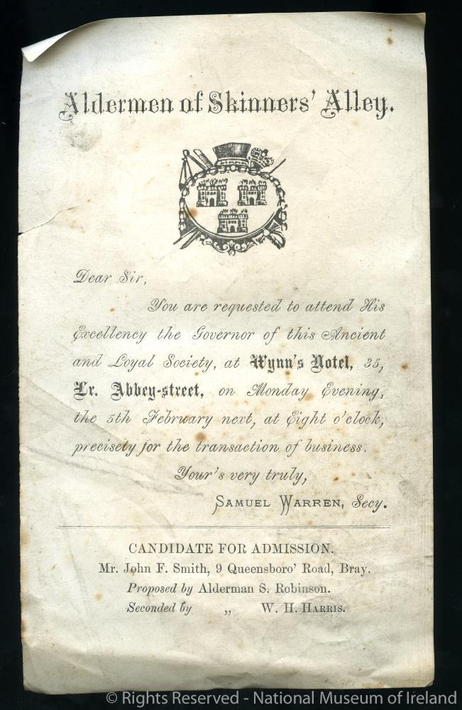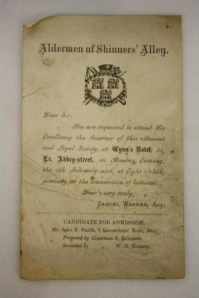 Regalia of the Corporation of Skinner's Alley. Copy of the Aldermen of Skinner's Alley letter to members to attend a meeting at Wynn's Hotel on Lower Abbey Street, on 5th February, to conduct business; the admission of members. The candidate for admission is Mr John F. Smith of 9 Queensboro Road, Bray, nominated by Alderman S. Robinson, seconded by Alderman W.H. Harris. Signed by Secretary Samuel Warren. Undated.