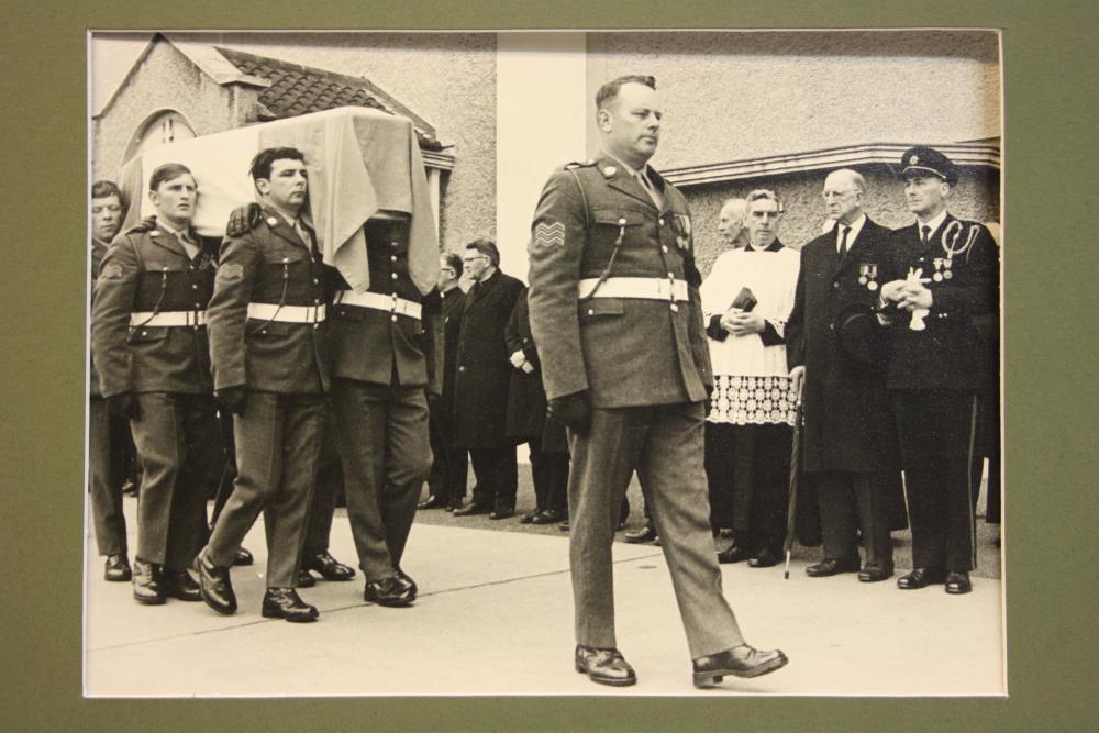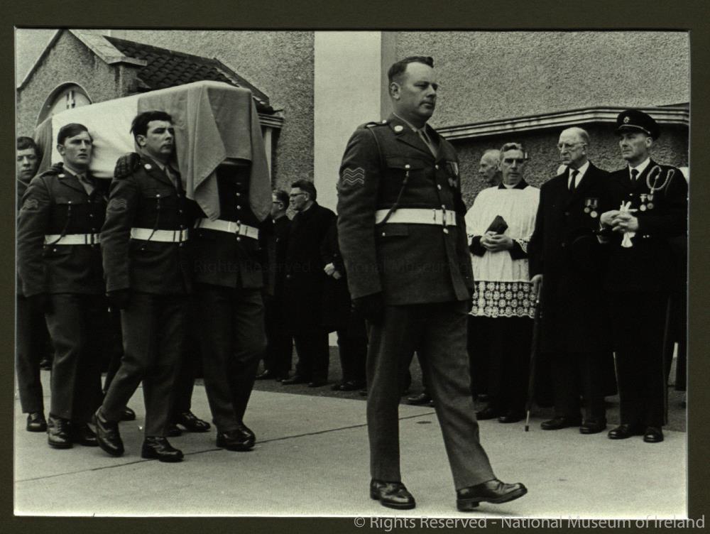 Funeral of Seán Lemass. 1971. Black and white print showing coffin draped in a tri-colour flag being carried by members of the Army. Eamonn De Valera stands in the background.;