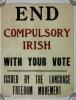 Poster issued by the Language Freedom Movement . Text: 'End Compulsory Irish With Your Vote/ Issued By The Language Freedom Movement'. Printed by the Dungarvan Leader. Length 57.3 cm x Width 44.5 cm.