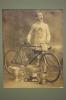 Photographic portrait, full length, of Michael Walker, road cyclist, who participated in the 1912 Olympics in Great Britain. With bicycle and trophies.