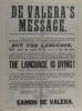 Large framed poster, in black and white print. The headline reads, "De Valera's Message", with a subheading, "The Language is Dying!". It ends with the name "Eamon De Valera" below which are the numbers III 19. Probably c. 1932.