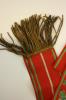 Sash of Ancient Order of Foresters. 6.6 cm. wide silk. Red field with a green stripe on either side and a white one in the center; the stripes, 4 cm. wide. Gold tassels. Embroidered on one arm of sash 'PCR' (Past Chief Ranger) over an eye, over a crest, over A.O.F., over the globe, surrounded by a...