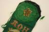 Ancient Order of Hibernians ribbon badge, c. 1900. 21 x 7.5 cm. with 5 cm. gilt metal thread fringe. Green poplin with rosette at top (with sequin and gilt metal thread centerpiece). Painted on body: A.O.H. (in pink-top-shading to brick red) over a shield depicting the badge of the society (a rayed...