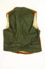 Saffron vest, six buttons down the right hand side front. Two pockets at the front. Green coloured back panel with strap. Worn with the black jacket, with three Clann na nGaedheal buttons down the front, and one on each shoulder strap. Part of the costume worn by William Pearse.