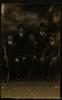 Postcard photograph; group of Irish Volunteers, central figure in uniform, the others wearing bandoliers. Armed. Studio photograph, undated, but possibly between 1914 and 1916.